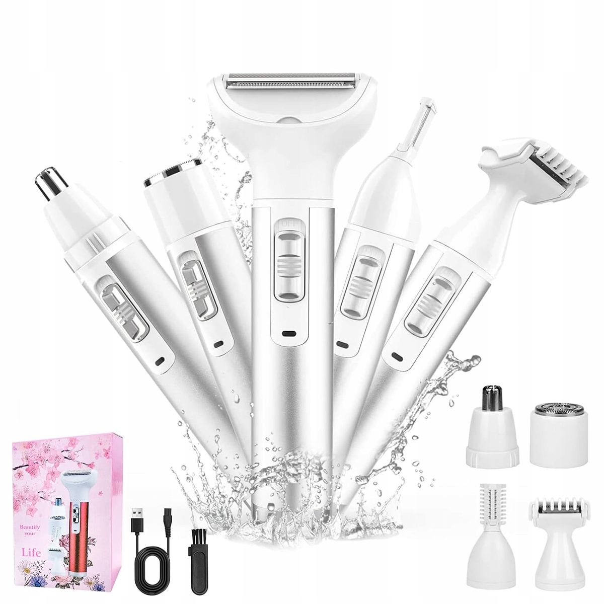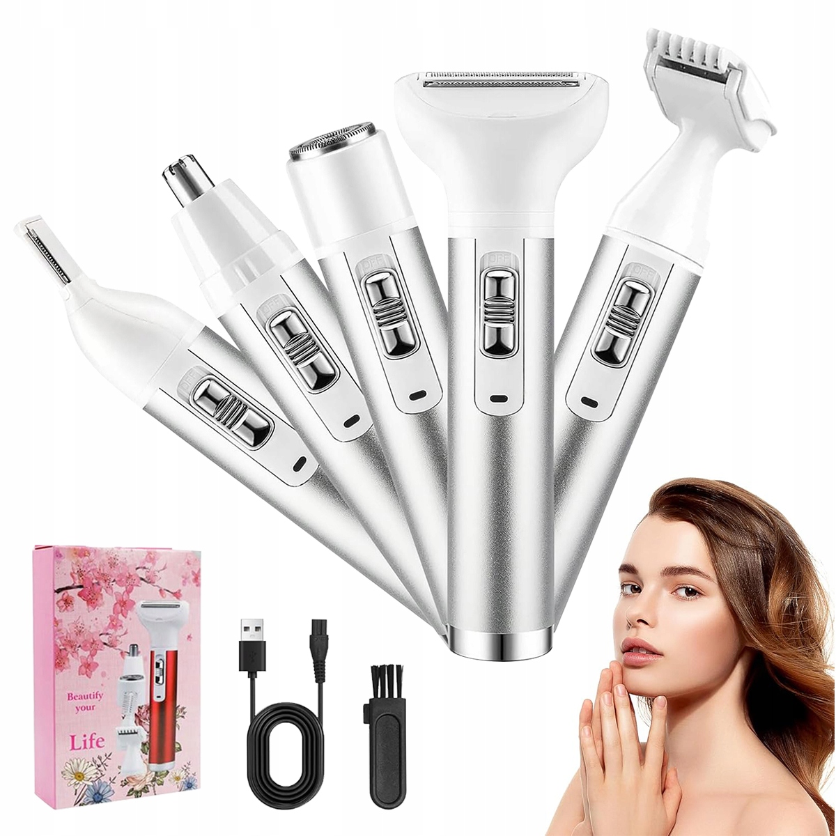 5 в 1 комплект електричного гоління містить 5 багатофункціональних голов, які можуть негайно зняти волосся з обличчя, руки, ноги, лінія бікіні, ніс, брови, рот тощо, залишаючи шкіру плавнішою.