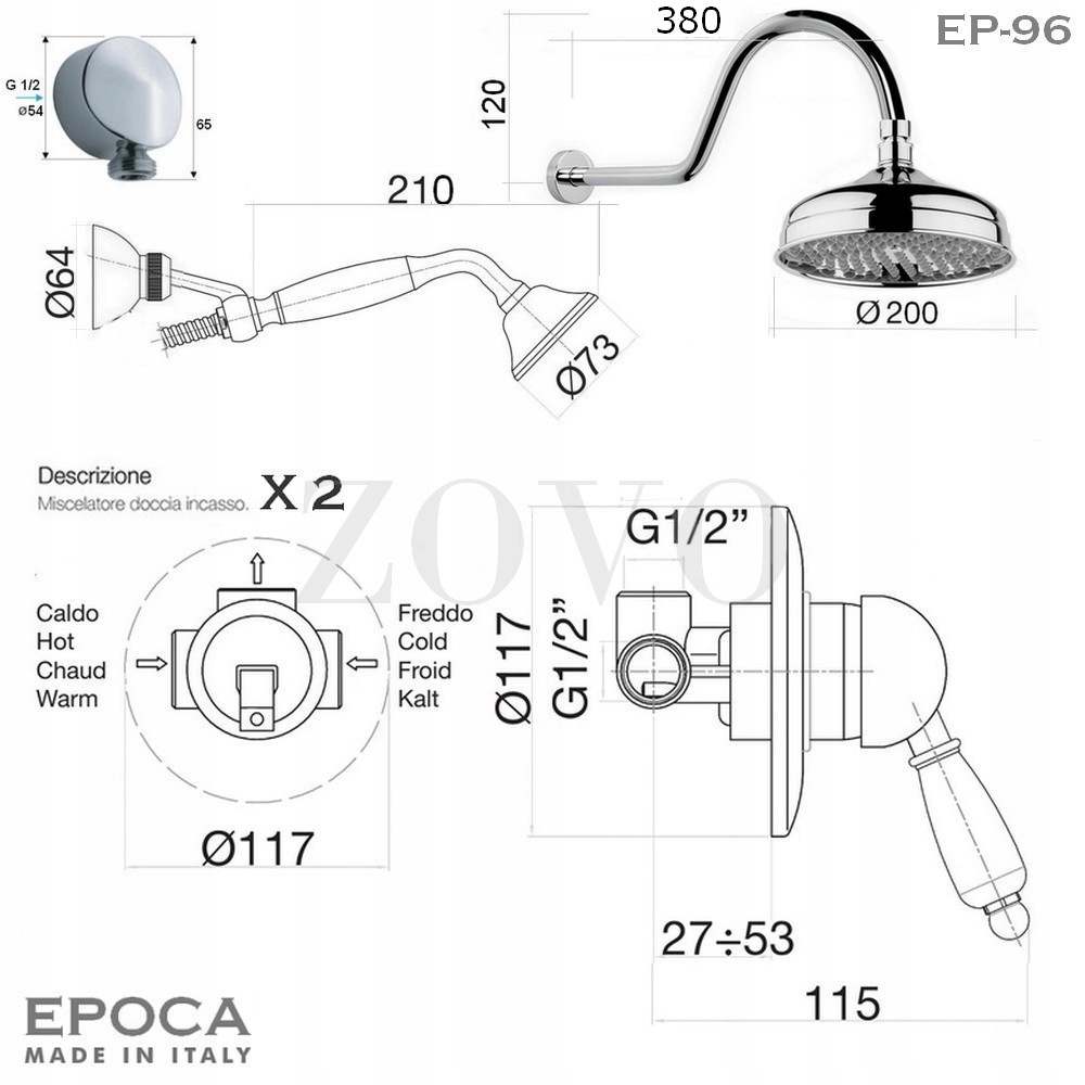 EPOCA retro, прихований, двосторонній душовий набір. Трубка, тропічний душ 20см. Порцеляна, хром.