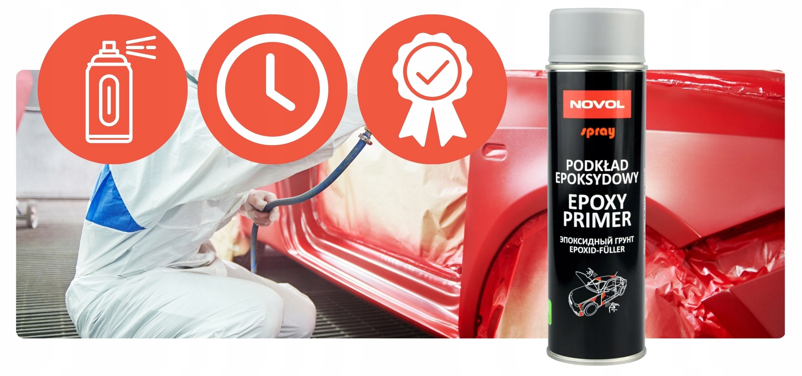 NOVOL EPOXY PRIMER — це професійна епоксидна ґрунтовка у вигляді спрею, яка забезпечує чудові антикорозійні властивості та ідеально підходить для локального ремонту фарби. Його однокомпонентна аерозольна формула забезпечує легке та швидке нанесення. Продукт характеризується мінімальною температурою нанесення +15°C і швидким часом затвердіння всього 10-15 хвилин при температурі 20°C. Завдяки точковій насадці NOVOL EPOXY PRIMER забезпечує точне та рівномірне покриття, що важливо при дрібному ремонті автомобіля.