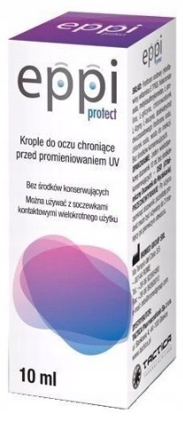 Eppi Protect очні краплі з офтальмологічним розчином, що захищає від УФ-променів, на основі рибофлавіну натрію фосфату 0,05%, вітаміну Е TPGS, MSM, амінокислоти і гіалуронова кислота. Краплі захищають рогівку, кришталик і сітківку від ультрафіолетового випромінювання, синього світла, штучних джерел світла та тривалого перебування на сонці, запобігаючи пошкодженням, спричиненим цими факторами, таким як кератокон’юнктивіт, катаракта та ВМД.