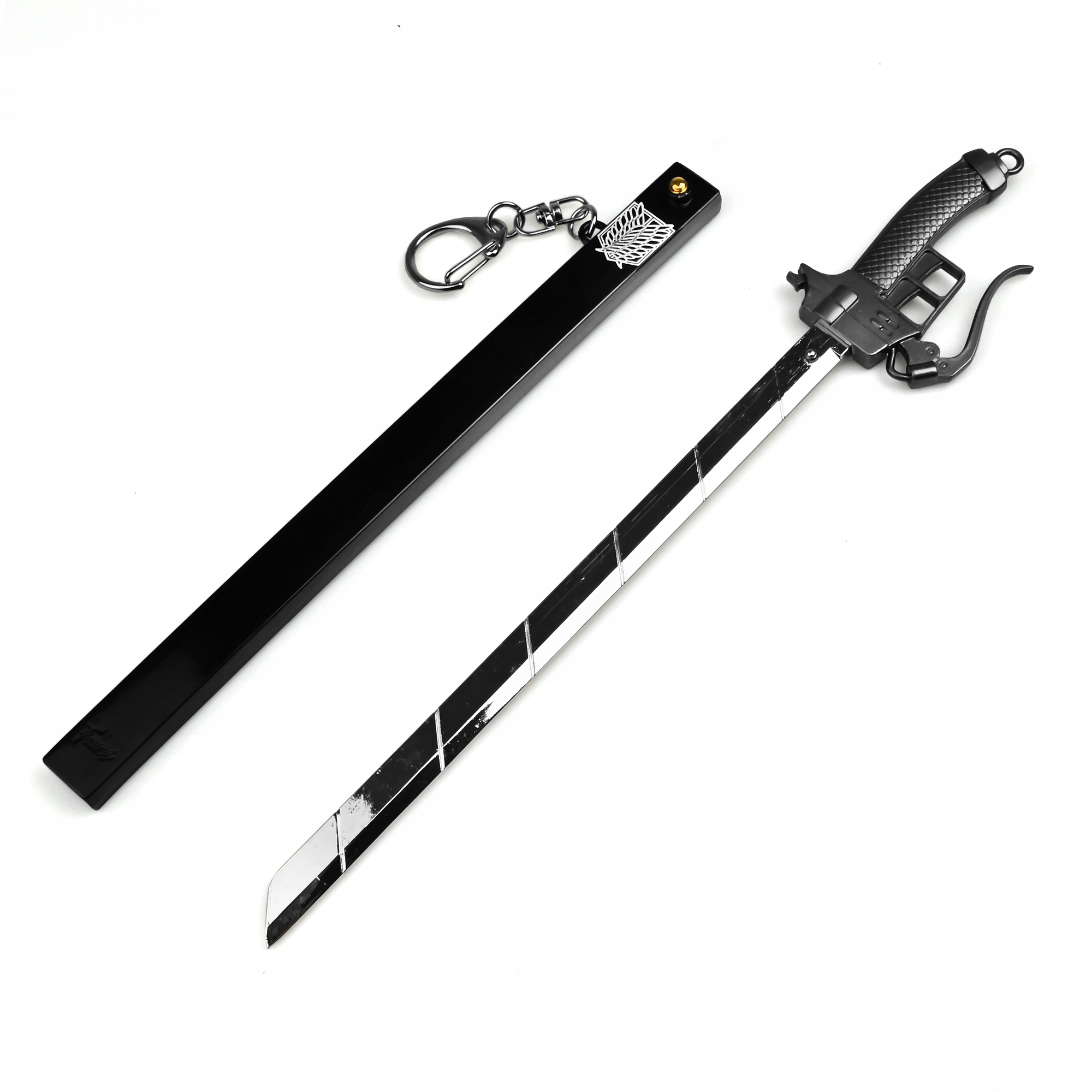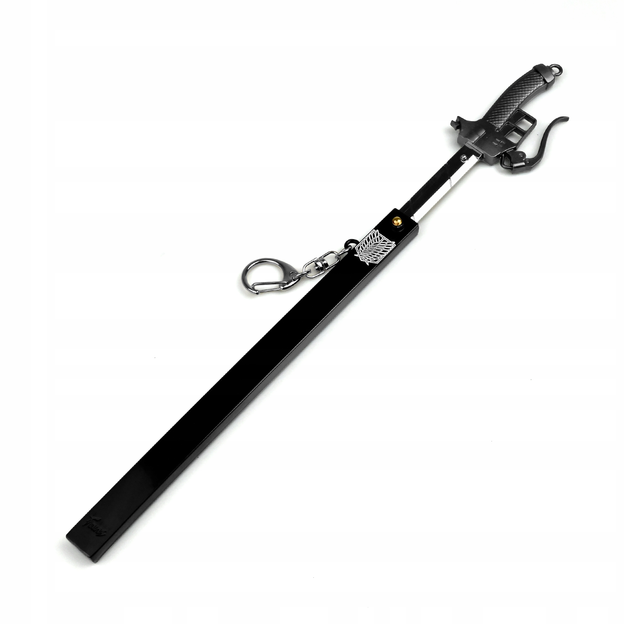Кільце Sword Key Erena Jaeger - це унікальний гаджет колекціонера для шанувальників нападу "Титан", ретельно розроблений для відображення знакової зброї аніме. З довжиною 170 мм, це ключове кільце виготовлено з високоякісного металевого сплаву, що забезпечує довговічність та елегантний зовнішній вигляд. Ручка має текстуровану ручку, а елегантна чорна піхва прикрашена емблемою розвідувального корпусу, що робить її унікальним і значущим елементом для кожного любителя аніме. Цей універсальний брелок ідеально підходить для прикраси ключів, рюкзаків або колекцій, що є як функціональним доповненням, так і символічним посиланням на світ атаку Титану. Детальна конструкція включає металеві акценти та гострі лінії, які відображають зброю, яку використовує Ерен Джегер у своїх битвах з "Титанами". Світло і компактний, ідеально підходить для повсякденного використання, підтримуючи його високоякісну зовнішність. Як виразний елемент кожної колекції, гаджет цього колекціонера атаку "Титан" відображає суть інтенсивності та героїзму серіалу. Чудова ідея подарунка для шанувальників аніме відзначає дух мужності та рішучості, які є центральними для сюжету. Візьміть з вами частину титанової спадщини і з гордістю покажіть свою пристрасть до серіалу.