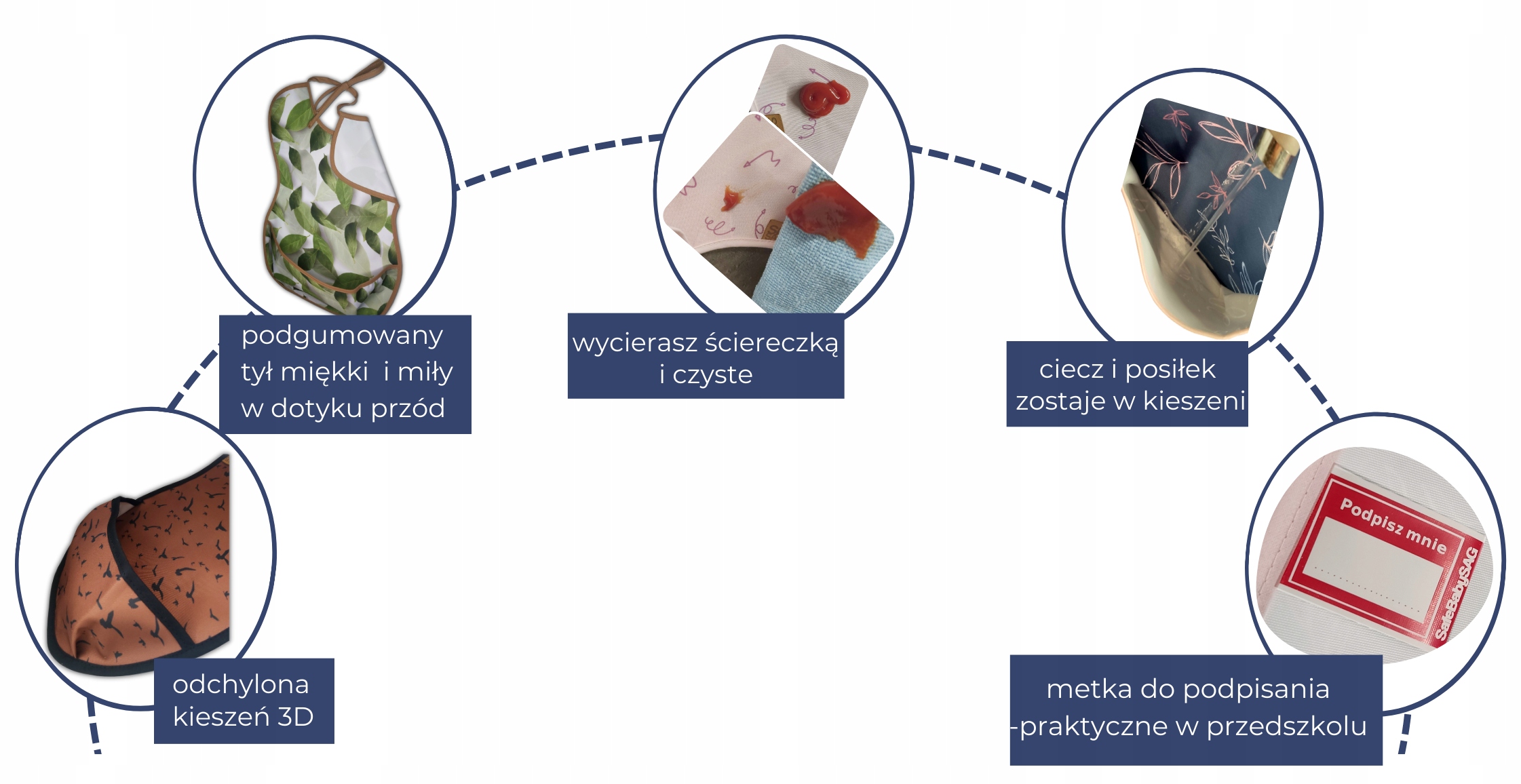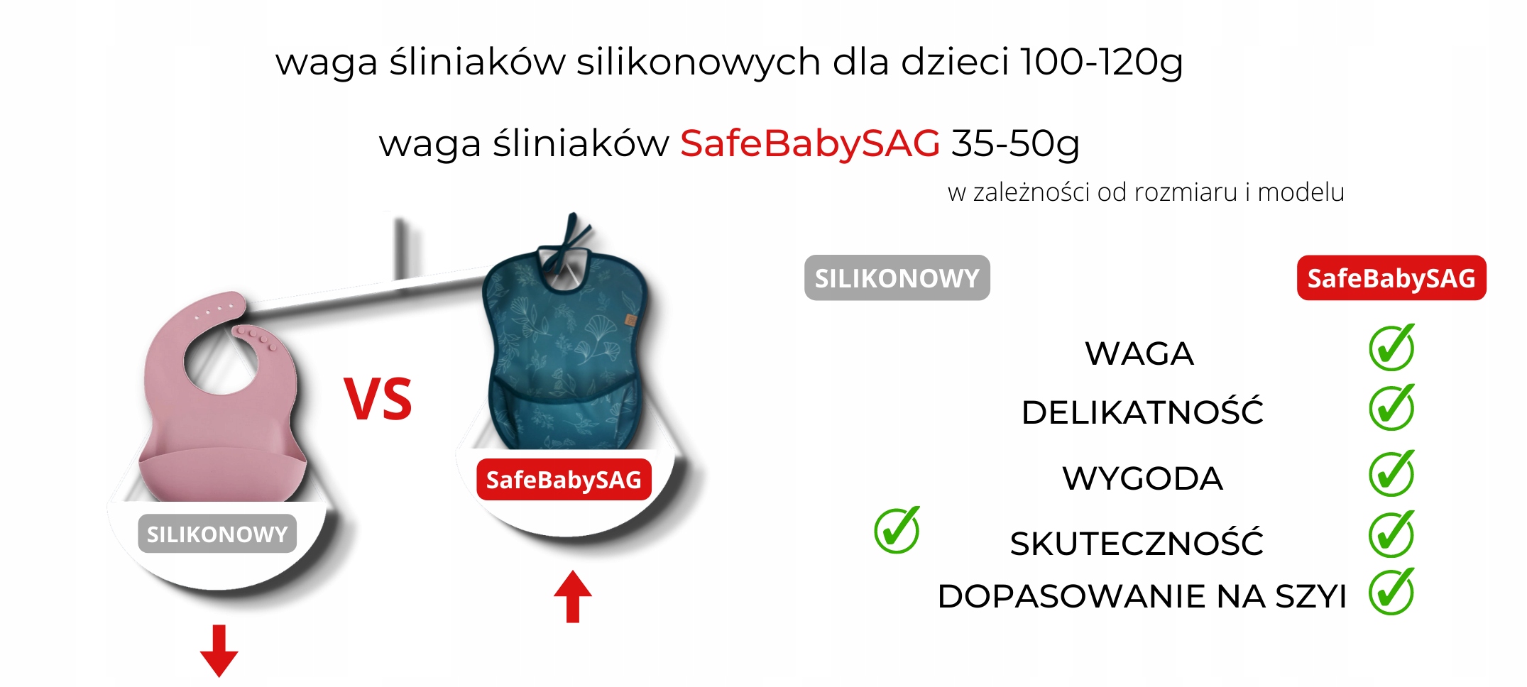 Водонепроникні нагрудники SafeBabySAG виготовлені з тканини найвищої якості, найважливішою перевагою якої є водонепроникність - як у силіконового нагрудника . Тканина м'яка - як тканинний нагрудник. Ми довго працювали над кишенею. Тести, розмови з користувачами, особистий досвід і робота з тканиною дозволили нам створити вироби з 3D навісною кишенею, яка не закривається і працює на рух користувача. Глибина кишені запобігає падінню під час нахилу. Нашу продукцію відрізняє мала вага, м'якість, легкість очищення та швидка готовність до повторного використання. Бавовняна окантовка навколо нагрудника та лямки для кріплення не подразнюють шкіру. Зав'язування є найефективнішим - швидким і виключає ризик того, що пацієнт зніме нагрудник самостійно, і дуже міцним на відміну від липучок, які швидко виготовляються і можуть дратувати, або гачки, які легко «розробляє» дитина. Крім того, зав’язка дозволяє нагруднику ідеально прилягати до шиї, щоб уникнути потрапляння бруду під нагрудник.