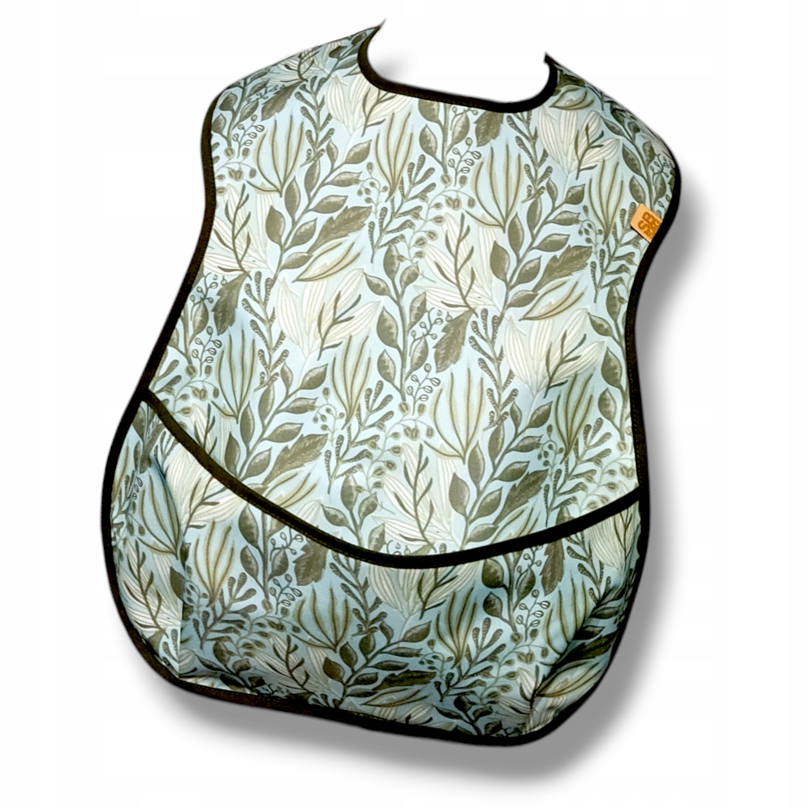 Нагрудник легкий, водонепроникна прогумована тканина. захищає від бруду, і при цьому залишається комфортним при контакті з тілом. Дуже важливою особливістю наших виробів є відкидна кишеня, яка вловлює падаючі залишки їжі чи напоїв. Глибина кишені запобігає падінню під час нахилу. Форма нагрудника нагадує пісочний годинник. Закриває плечі, звужується в області руху рук - тому не рухається, і знову розширюється внизу. Додатковою перевагою наших нагрудників є легкість чищення та швидка готовність до повторного використання. Наші вироби відрізняються невеликою вагою і м'якістю. Бавовняна облямівка навколо нагрудника та шнурки для застібки не подразнюють шкіру. Зав'язування є найефективнішим - швидким і виключає ризик того, що пацієнт зніме нагрудник самостійно, і дуже міцним на відміну від липучок, які швидко виготовляються і можуть дратувати, або гачки, які легко «розробляє» дитина. Крім того, зав’язка дозволяє нагруднику ідеально прилягати до шиї, щоб уникнути потрапляння бруду під нагрудник.