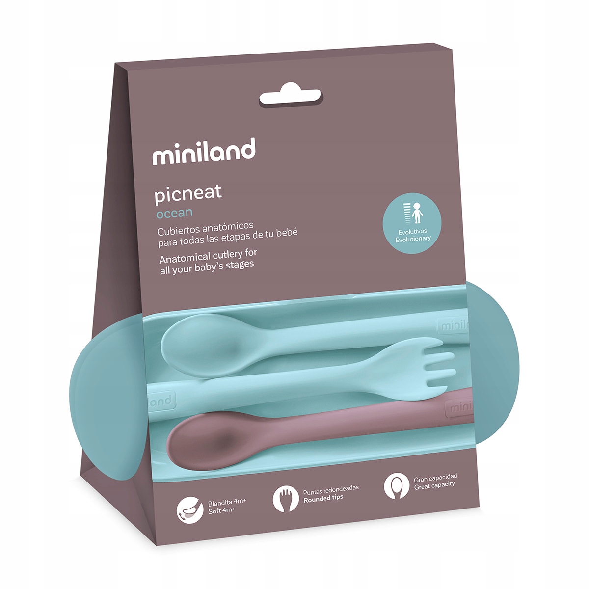 Еволюційний ергономічний набір столових приборів із захисним футляром. У комплект входять дві ложки (одна м’яка, друга твердіша) і виделка з круглими зубцями, усі вони придатні для контакту з яснами дитини. Набір має приємний морський колір і його можна мити в посудомийній машині.