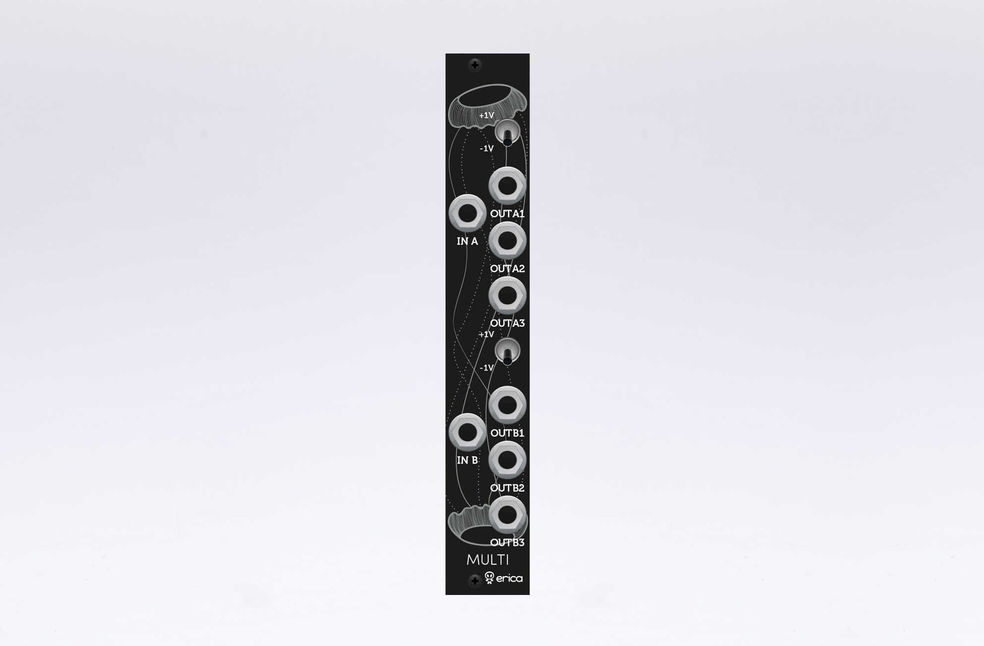 Erica Synths Black Multi — це високоточний активний множник 2x1to3 або 1to6 із буферизацією, який працюватиме для поділу сигналу в будь-якій схемі, включно з керуванням кількома VCO, які синхронізуються з одного джерела CV. Перемикачі зсуву «Octave» або +-1V на обох каналах дозволяють додавати або віднімати один вольт від кожного каналу, таким чином транспонуючи VCO на одну октаву вгору або вниз. Прихована функція – настроюване зміщення – дозволяє встановити визначене користувачем зміщення на першому каналі.