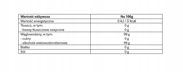 Еритритол характеризується ніжним, солодким смаком. Він ідеально підходить для випічки та приготування їжі, тим самим зменшуючи вміст калорій у підготовлених стравах. Має нульові калорії.