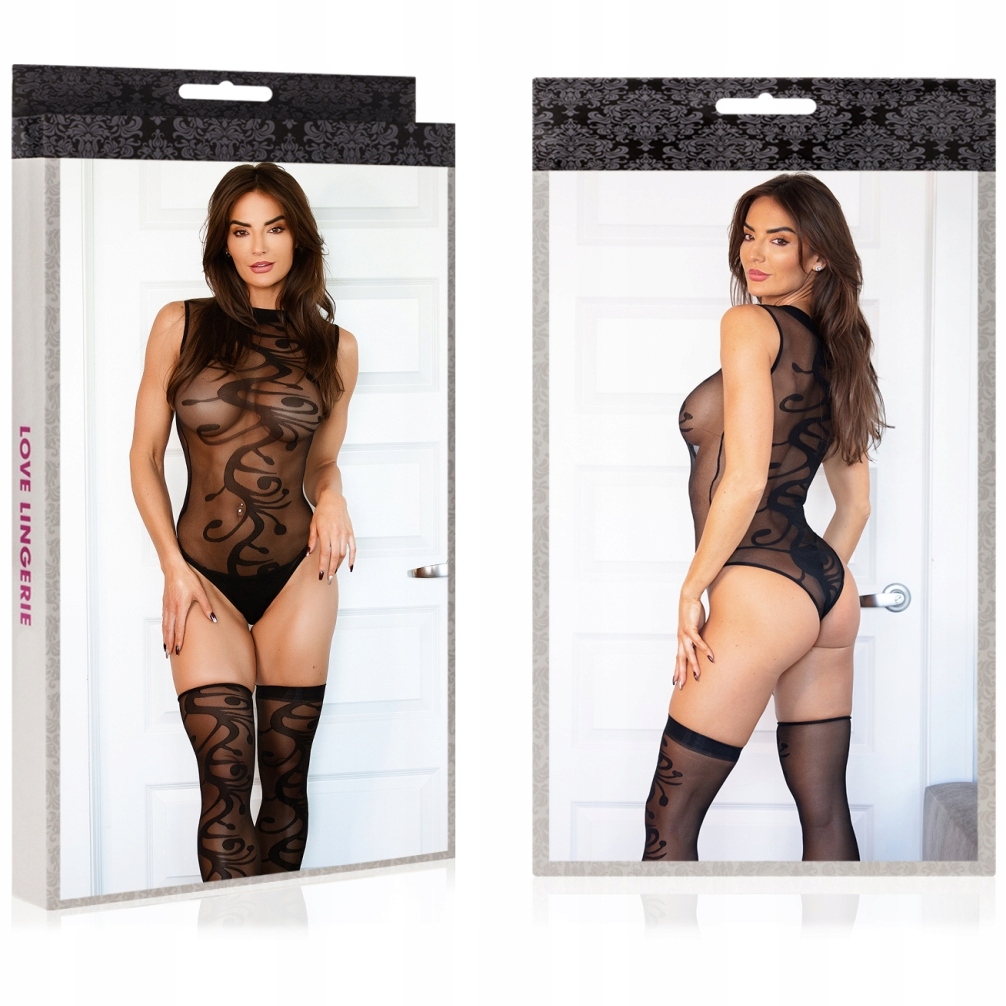Дуже елегантне, чуттєве еротичне боді з панчохами. Набір прикрашений красивим рослинним орнаментом. Цей приголомшливий візерунок додає нотку розкоші загальному вигляду. Частина трусиків красиво сидить на сідницях, ще більше оголюючи їх. Високе декольте радує уяву і, незважаючи на прозорість вбрання, залишає нотку загадковості. Нижня білизна ідеально підходить для пікантного побачення з гарячим фіналом.