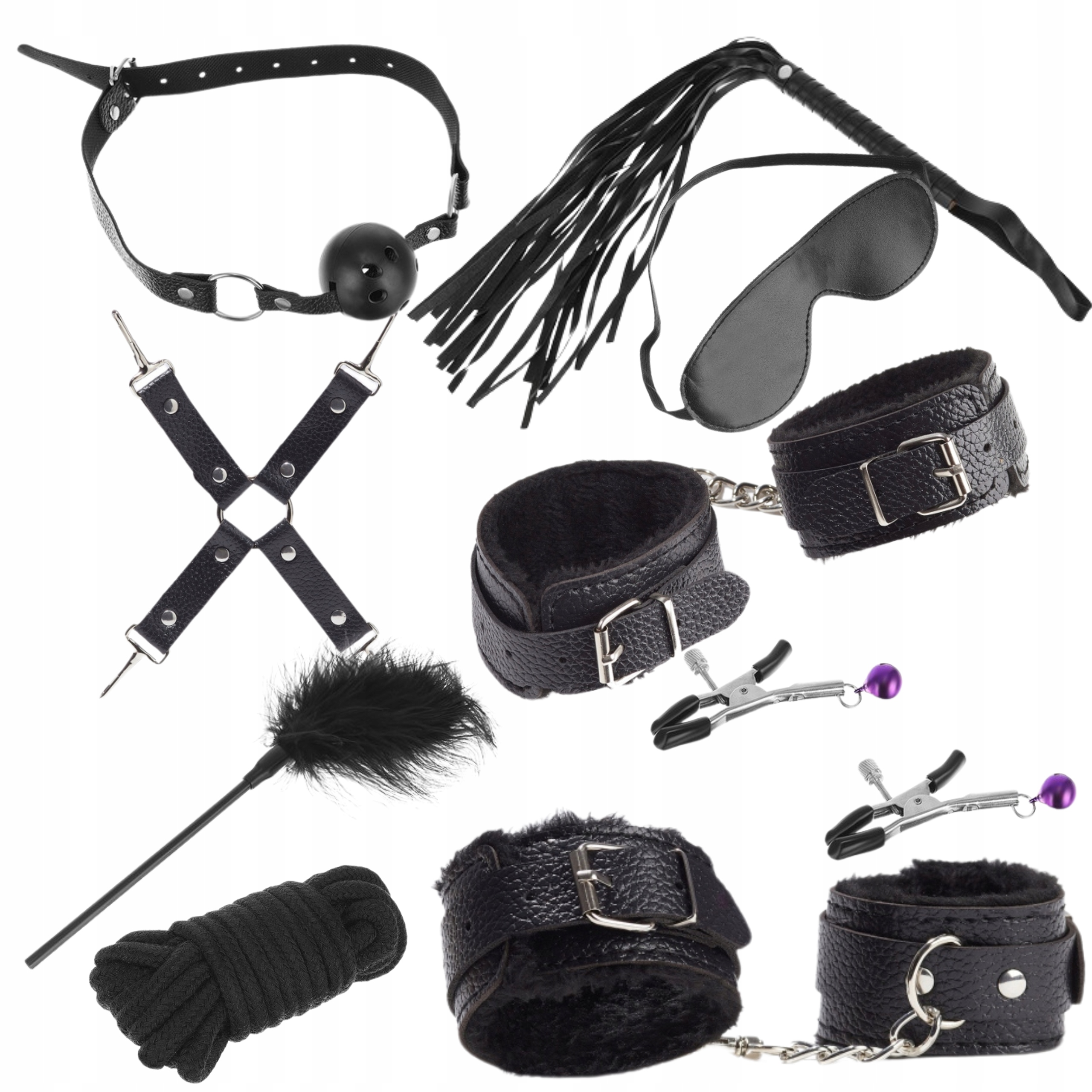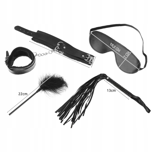 Набір складається з: 2 пари наручників для ніг і рук, товста мотузка, маска, нашийник з повідком, батіг, кляп з м'ячем, з'єднувальні ремені наручники, пір'я та затискачі для сосків. Завдяки багатому вмісту набір відкриває двері до нових вражень і дозволяє позбутися рутини в кожній спальні, вносячи трохи таємничості та пристрасті. Це ідеальне рішення для пар, які хочуть розкрити свої фантазії та підігріти атмосферу у стосунках.