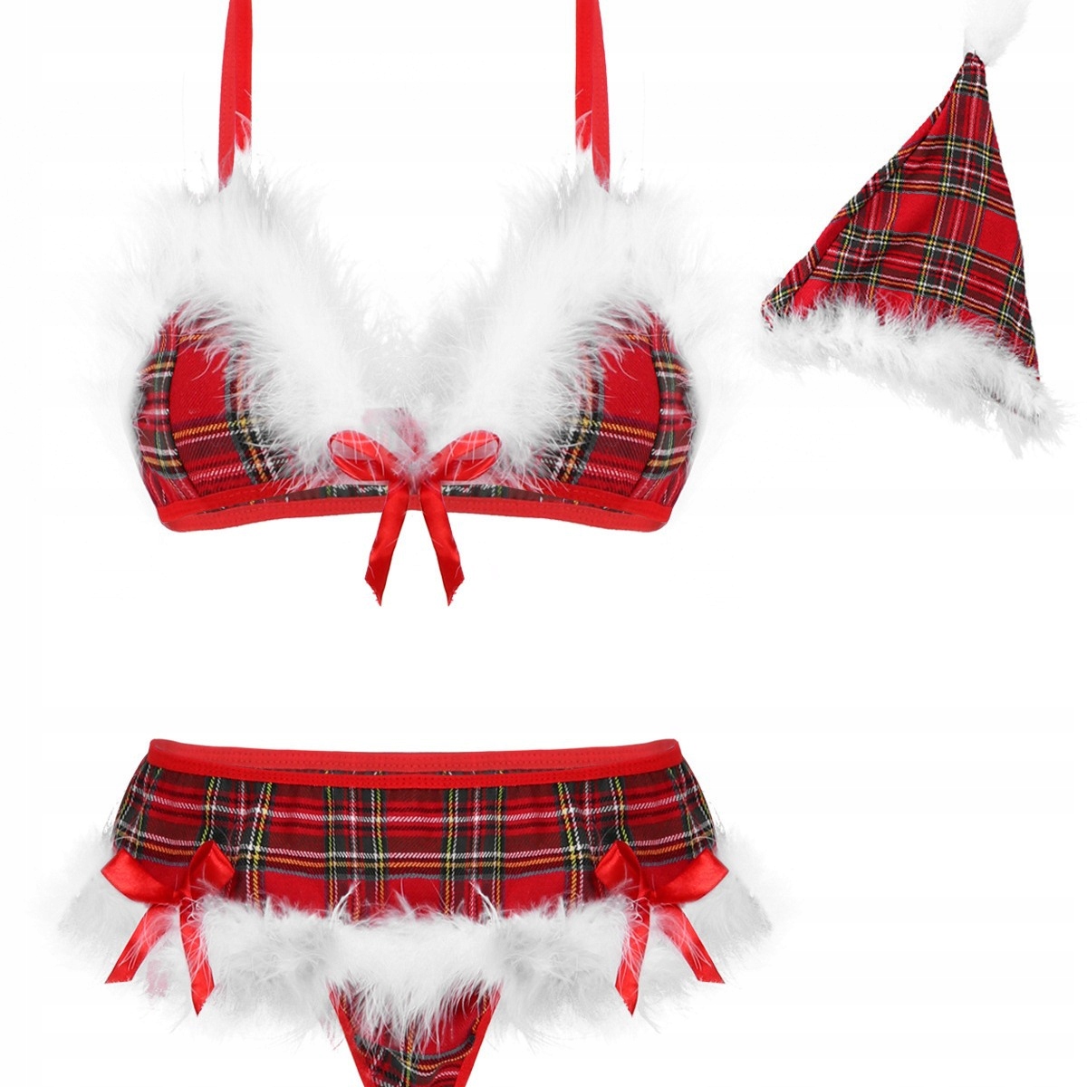 Сексуальний різдвяний жіночий комплект нижньої білизни в клітку, бюстгальтер з хутром, трусики та шапка Санти