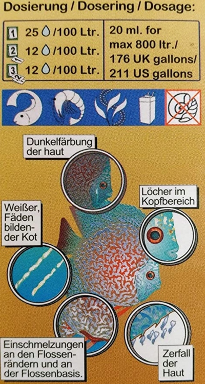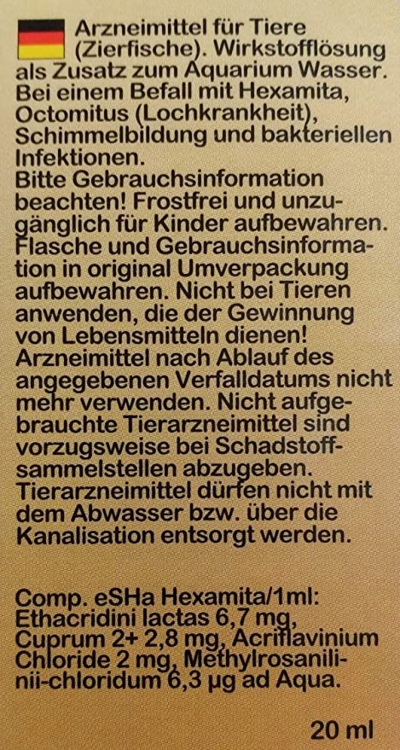 eSHa HEXAMITAце унікальний продукт, розроблений для боротьби з гексамітозом (пустоподібним суслом), яким може страждати дискус. eSHa HEXAMITA спеціально розроблений для використання з цихлідами (ідеально підходить для дискусів і скалярій). Однак його також можна використовувати для багатьох тропічних і холодноводних риб. Шкідливий для акваріумних равликів.