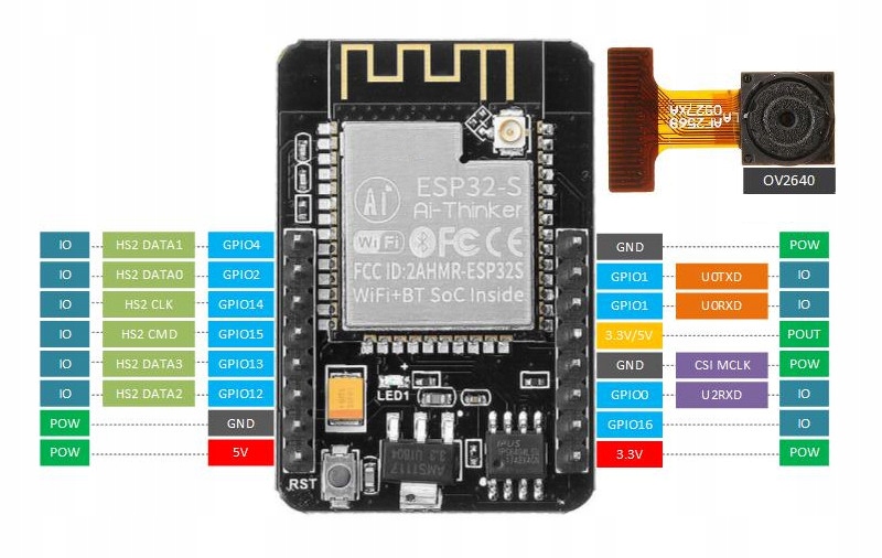 Прототип плати ESP32-CAM на основі системи ESP32S із вбудованим пристроєм для зчитування карт пам’яті TF (теоретично microSD до 32 ГБ) і роз’ємом для камери (OV2640/OV7670). ESP32-CAM, як і всі інші з серії ESP32S, пропонує зв'язок через WiFi і Bluetooth. Він може працювати в різних середовищах програмування, включаючи Arduino.