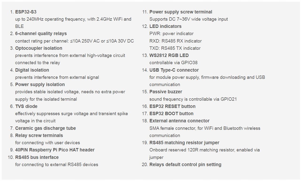 6 каналів, підтримка керування Wi-Fi/Bluetooth/RS485, має інтерфейси RS485/Pico HAT на борту, з декількома схемами захисту ізоляції, промисловий корпус, монтаж на рейку DIN.