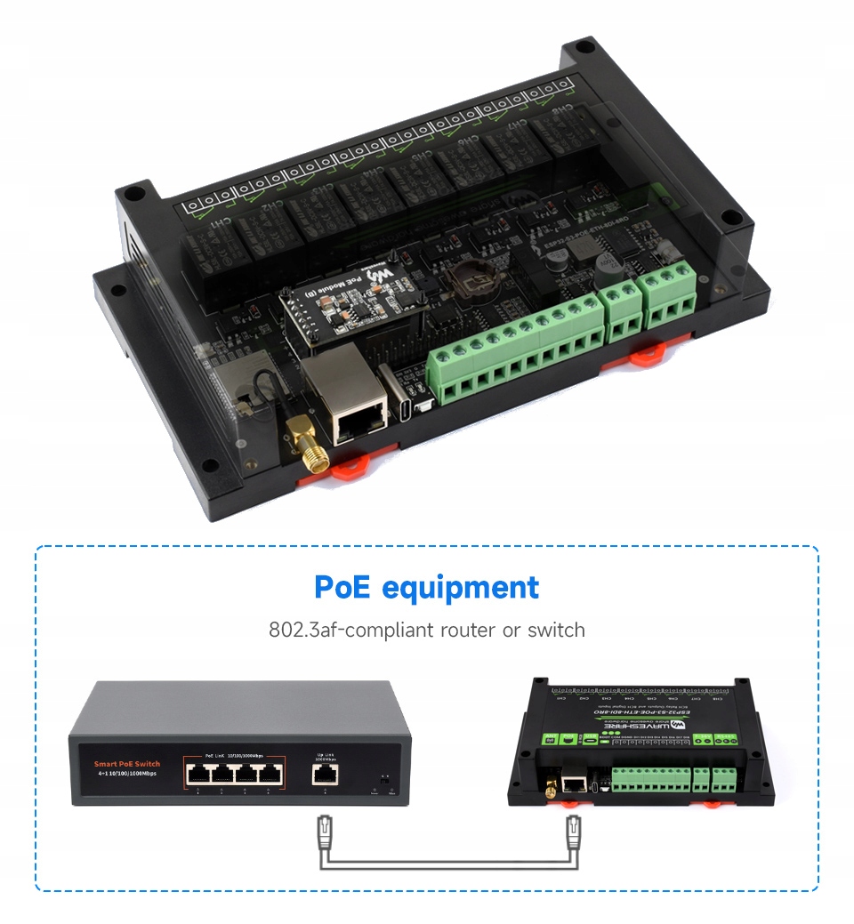 POE варіант має вбудований модуль pd (powereddevice) відповідно до Normieeeee802.3af , завдяки якому передача даних про передачу одного кабелю 10/100mb/s . Це рішення спрощує установку - вам не потрібен додатковий джерело живлення або 230 В розетки в шафі управління. Все, що вам потрібно, - це будь -який активний перемикач або інжектор (клас0/3, до 15,4 Вт), який повністю охоплює споживання самого контролера та всіх восьми реле. Wavesharewaveshare