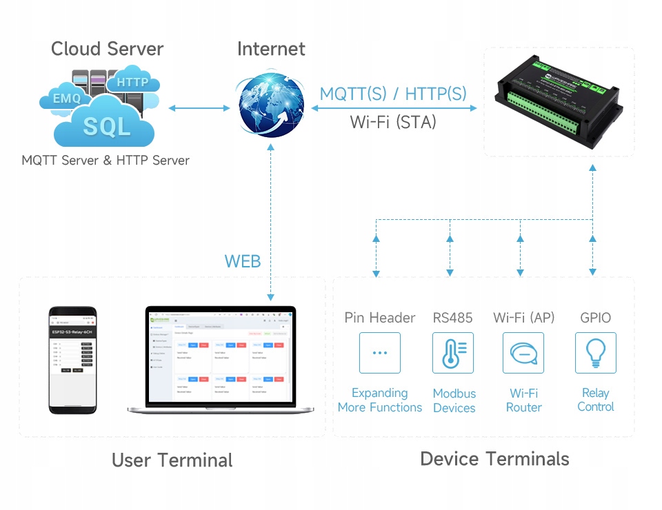 Модуль ESP32-S3-8DI-8RO-C дозволяє миттєво включити свою установку в хмару: Після налаштування фальшивки Trybuvi, він надсилає дані на сервер MQTT (S) або HTTP (S)-ви можете використовувати власний EMQX, WaveShare.Cloud або будь-яку платформу IOT. У браузері на комп’ютері чи смартфоні ви отримуєте інтуїтивну веб -панель для візуалізації та управління кожним реле та цифрового входу. Пристрій працює одночасно з локальними воротами: через магістрат він збирає інформацію з датчиків, а провідним GPIO та PIN -голодником дозволяє легко додавати подальші модулі розширення. Коли ви вмикаєте Trybwi -fiap, контролер відіграє роль точки доступу, тому вся мережа автоматизації може працювати навіть там, де немає маршрутизатора. Як результат, один компактний контролер збирає сигнали від датчиків, підтримує реле, забезпечує веб -інтерфейс і безпечно публікує дані до хмари - просте рішення, яке скорочує час впровадження інтелектуальних домашніх та промислових додатків.