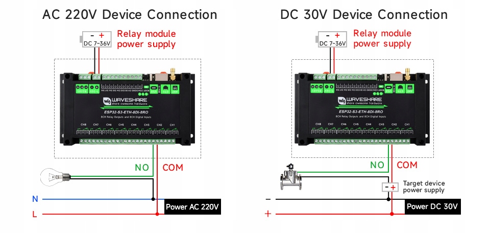 Наступна графіка показує, як ви можете легко використовувати модуль esp32-S32-eth-8di-8ro-c для прямого контролю обох мережевих пристроїв 230VAC, так і низькопостійних приймачів DO30VDC: