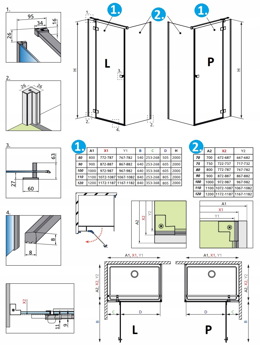 - Увага! За стандартним, кабіни відповідають монтажу на душовому підносі конкретних розмірів, і ці розміри наведені в ім'я кабіни або її частини. Фактичні розміри кабін трохи менші, ніж номінальний, наведений у назві статті. Якщо ви плануєте встановити кабіну безпосередньо на підлозі, зверніть увагу на розміри (x1, x2) та розміри до осі скла (y1, y2), які наведені в технічному кресленні.