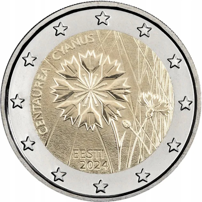 Естонська пам’ятна монета номіналом 2 євро була випущена в 2024 році під назвою «Волошка – національна квітка Естонії» в рамках серії монет із зображенням національних символів країни (у 2021 році «Вовк – національна тварина Естонії», у 2023 році «Звичайна ластівка – національний птах Естонії»). Особливу блакитну волошку було обрано національною квіткою Естонії в 1968 році. Це популярний естонський дизайн, який традиційно використовується як символ щастя та кохання.