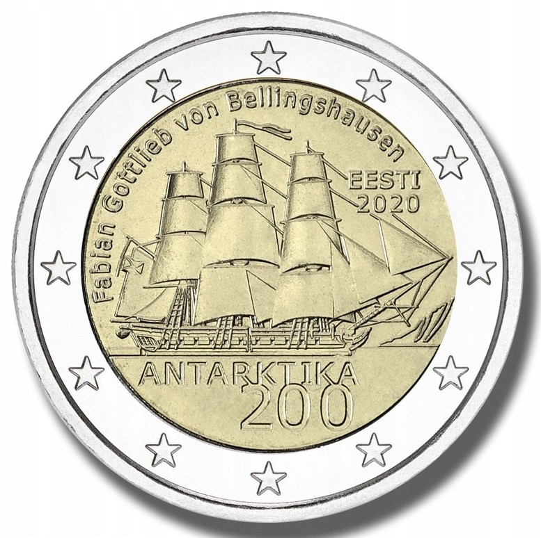 Пам'ятна монета Естонії номіналом 2 євро 2020 року присвячена 200-річчю відкриття Антарктиди, яке відбулося 27 січня 1820 року російською експедицією на чолі з Фабіаном Готлібом фон Беллінгхаузеном і Михайлом Лазарєвим побачили континент. Наступного дня експедиція у складі кораблів «Восток» і «Мирний» підійшла на 32 км від замерзлого континенту, побачивши перший крижаний бар’єр, який сьогодні відомий як Бар’єр Фімбул. На малюнку зображено корабель «Восток», на якому адмірал фон Беллінсгаузен здійснив навколосвітнє плавання. Написи навколо корабля: «Фабіан Готліб Беньямін фон Беллінсгаузен», а також назва країни-емітента та рік випуску «EESTI 2020». Під човном напис "АНТАРТІКА 200".