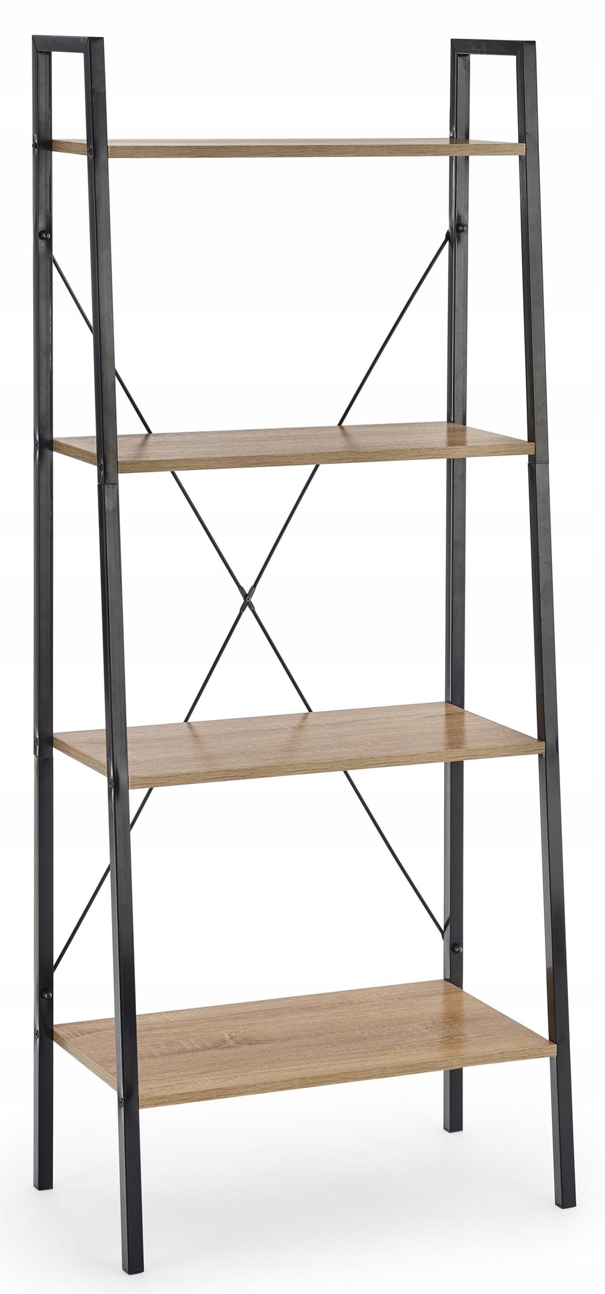 Практична і відносно недорога полиця для офісу, магазину, студії, вітальні, кімнати, холу, ванної кімнати. Виготовлений з металу (сталь з порошковим фарбуванням), чорного кольору. Стелажі з ламінованого меблевого щита кольору дуб сонома.
