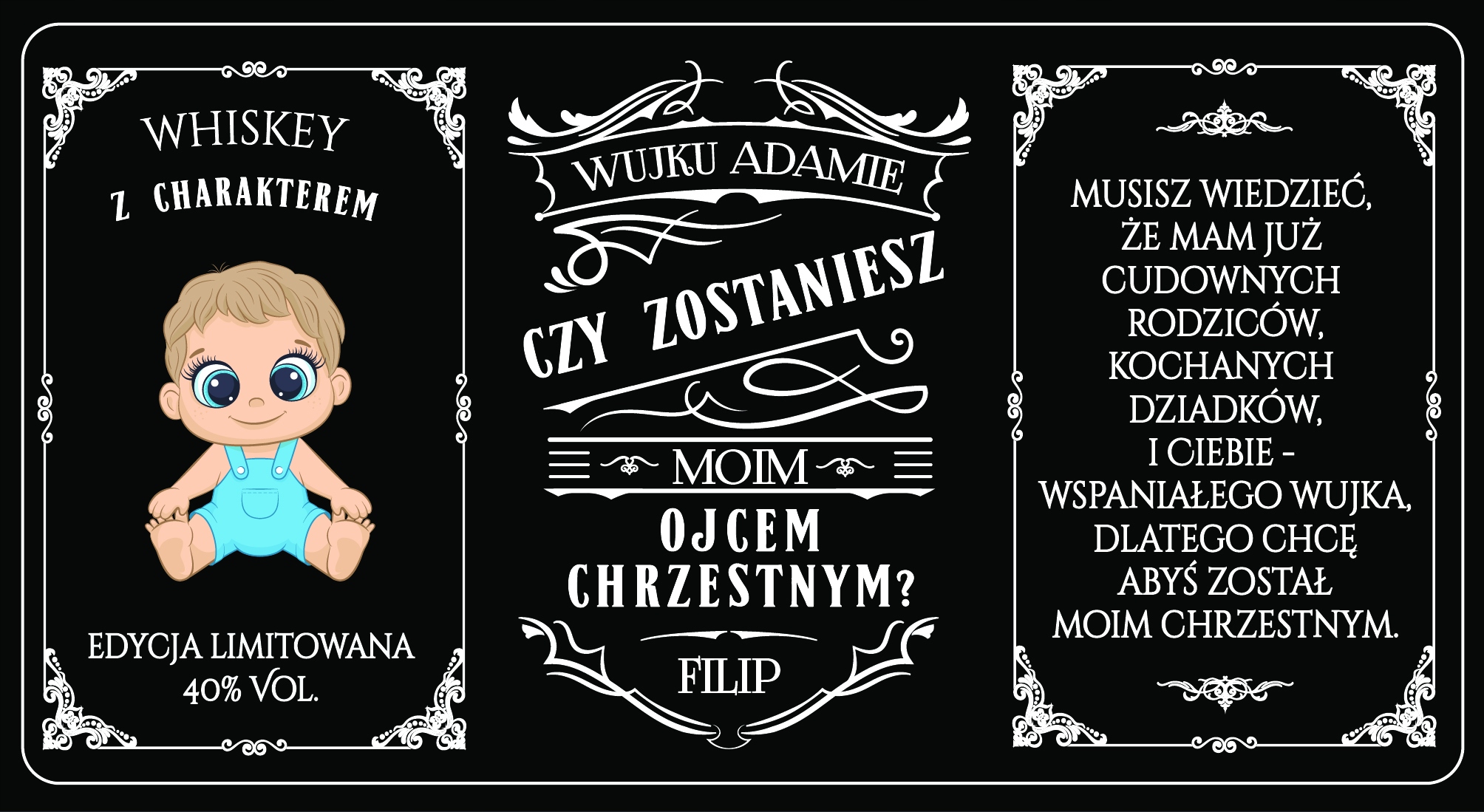 Прохання стати хрещеним батьком — це водночас прекрасний жест від Дитини та чудовий сувенір. Персональна алкогольна етикетка з коротким запитанням неодмінно стане приємним сюрпризом для майбутнього Хрещеного.