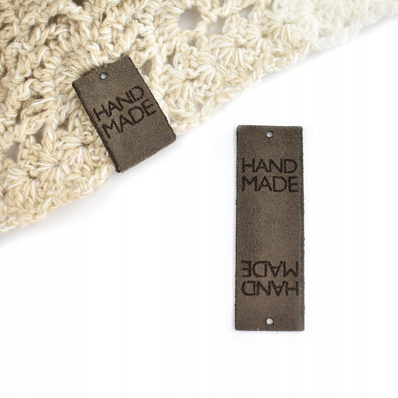 Ярлик з нубуку з написом "HAND MADE". Має два отвори для шиття.