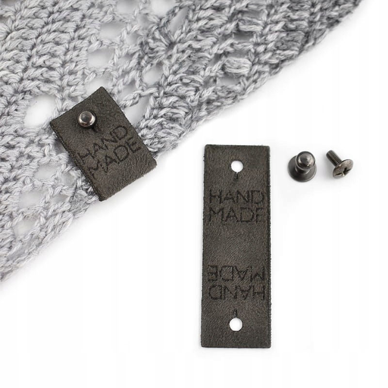 Ярлик з нубуку з написом "HAND MADE". Щоб встановити його, складіть тег навпіл і вставте одну частину металевої заклепки через два отвори, а потім загвинтіть іншу частину. Також можна використовувати плоску викрутку. Рекомендуємо зняти бірку перед пранням.