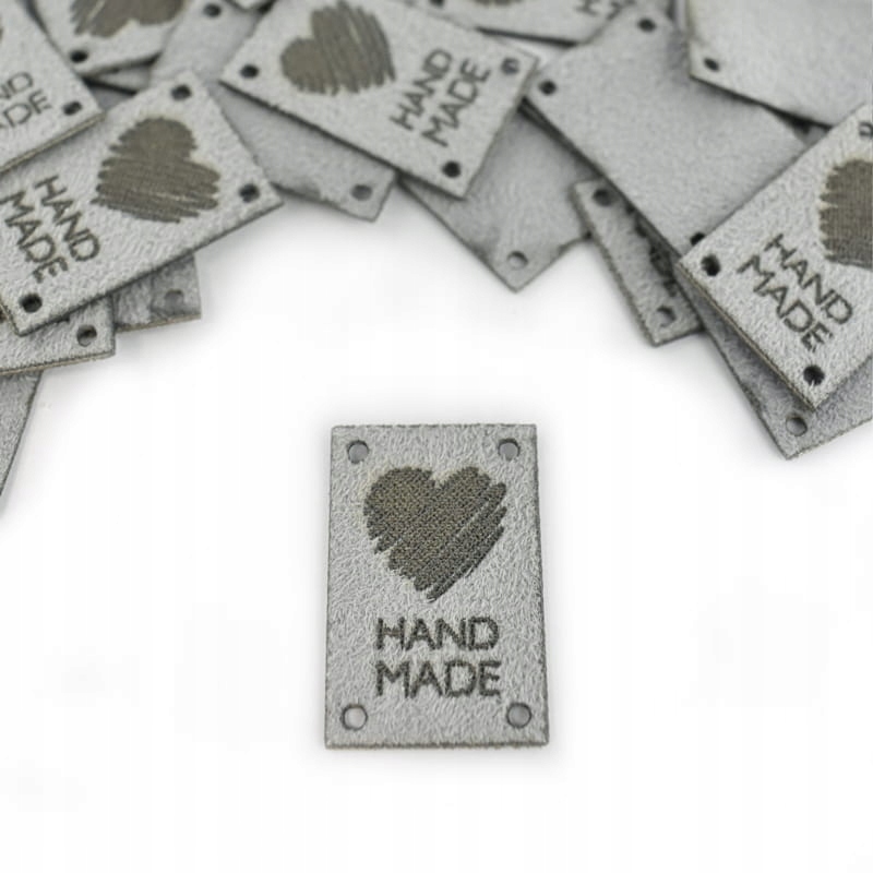 Етикетка з нубуку з написом "Handmade" та ескізом серця та чотирьох отворів для пришивання.
