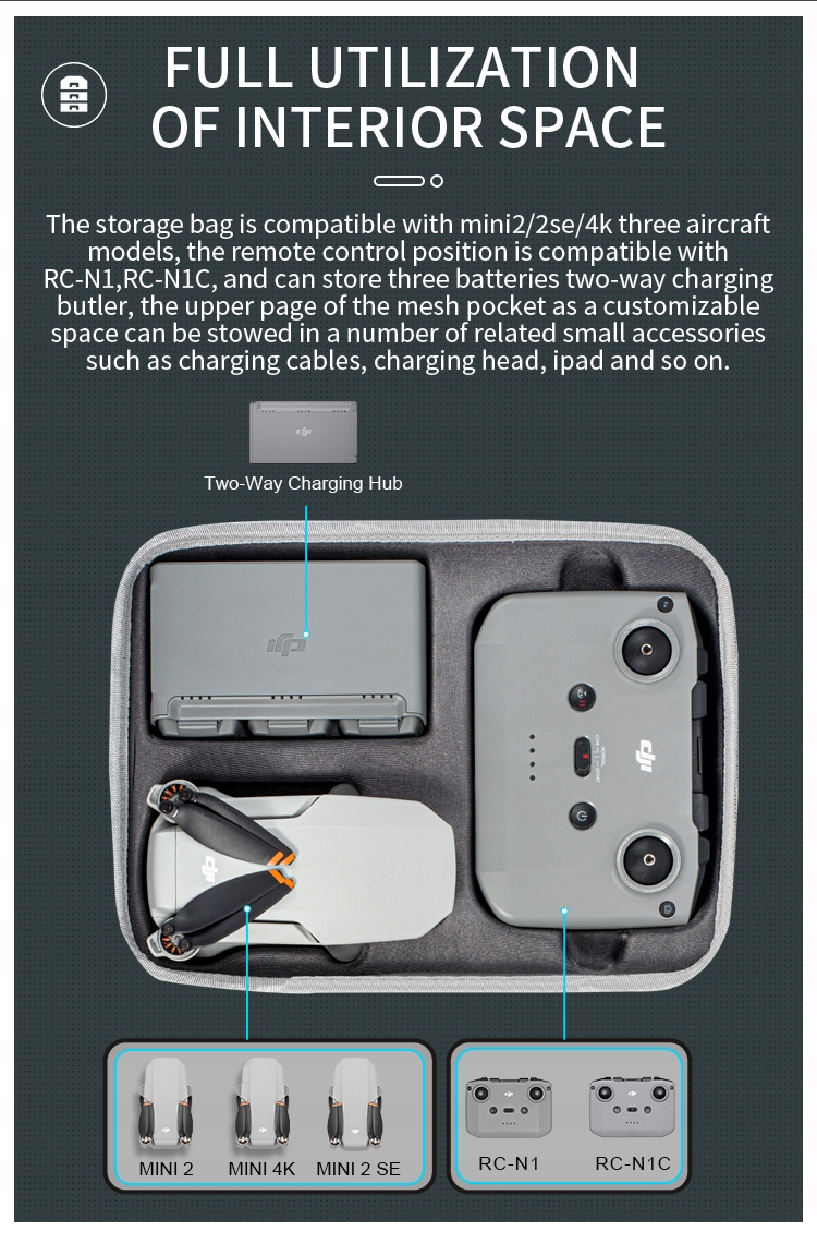 Велика місткість: наша сумка може вмістити: 1x Mini 4K Drone/Mini 2 SE Drone, 1x RC-N1 Remote Controller, 1x Charging Hub і 3x батареї, кабелі, пропелери, SD-карти та багато інших аксесуарів для дронів.