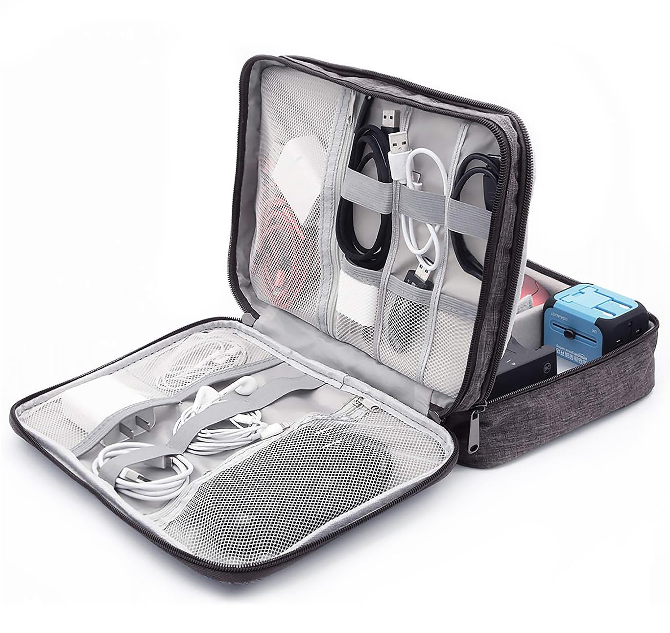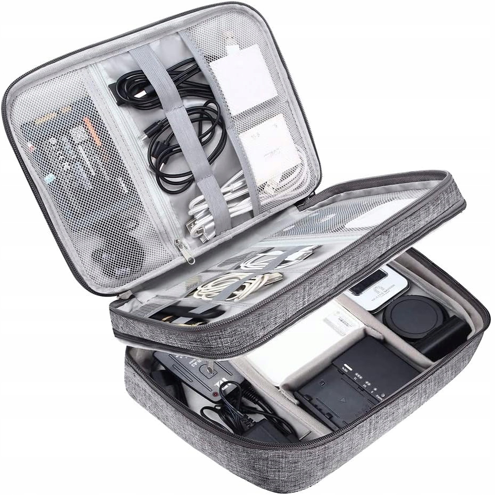 Упорядкуйте дрібну електроніку в одному естетичному футлярі, який можна брати з собою всюди. Якісний органайзер для кабелів, проводів, карт пам'яті та всіх інших аксесуарів для електроприладів. Виріб має 2 великих відділення на блискавці, велику кількість відділень і вкладок для зберігання необхідних аксесуарів. Чохол для кабелів та електроніки з ручною петлею, виготовлений із сірого меланжевого матеріалу на блискавці.