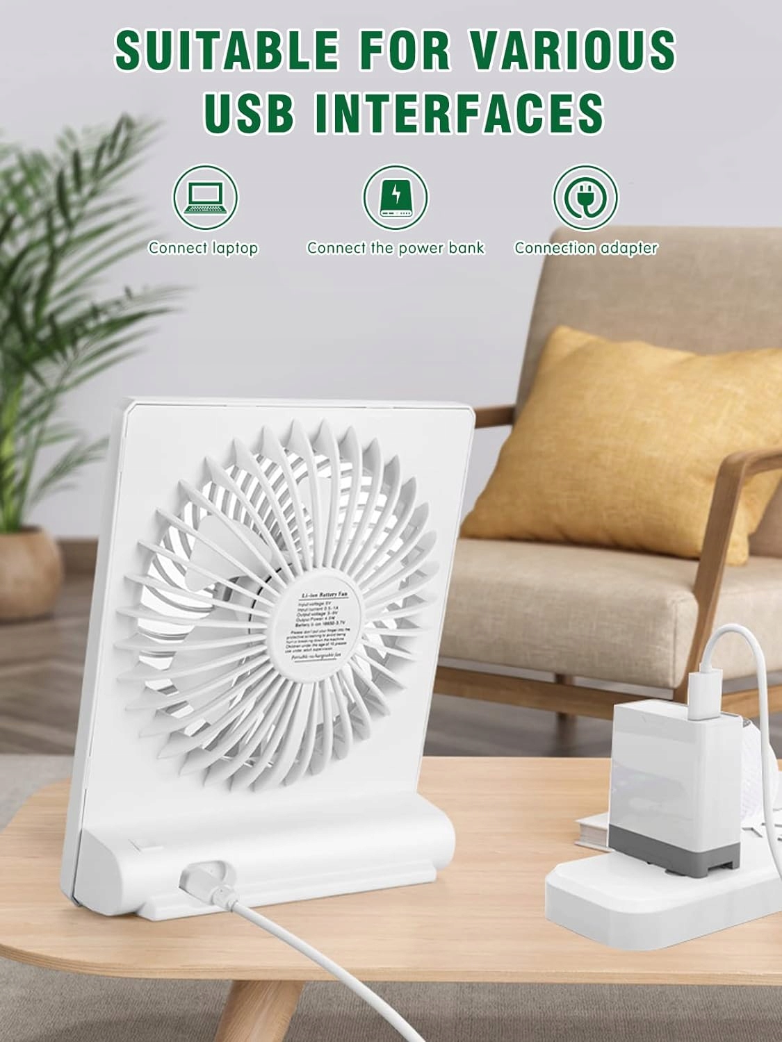 - Портативний вентилятор: розмір вентилятора становить 14 x 16 x 4,5 см, а його вага всього 210 г. Ви можете покласти вентилятори в сумочку і відправитися на роботу або в подорож, щоб насолодитися свіжим повітрям і прохолодою в офісі або під час подорожі. Ідеально підходить для дому, автомобіля, офісу, робочого столу, кемпінгу чи подорожей.