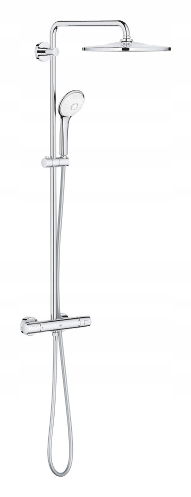 компоненти: горизонтальний поворотний кронштейн 450 мм термостат для поверхневого монтажу з функціональним перемикачем Aquadimmer: тропічний душ/ручний душ Rainshower Mono 310 тропічний душ (26 561) тип струменя: GROHE PureRain з кутом повороту кульового шарніра ± 15° ручний душ Euphoria 110 Масаж (27 221) 3 типи струменів: Rain, Massage, SmartRaina регульована душова ручка душовий шланг Silverflex 1750 мм (28 388) Термостатична головка GROHE TurboStat GROHE SafeStop блокування при 38°CGROHE SafeStop Plus включає додатковий обмежувач температури 43°CGROHE CoolTouch відсутність ризику опіків на гарячому поверхні GROHE MetalGrip ергономічні ручки GROHE DreamSpray ідеальний душ GROHE Long -Life FinishGROHE SprayDimmer (плавне зменшення потоку)GROHE FastFixation регульоване верхнє кріпленнявнутрішній водяний каналSpeedClean система проти вапняних відкладень Система TwistStop запобігає перекручуванню душового шланга адаптована до проточних нагрівачів з потужністю хв. 18 кВт хв. потік 7 л/хв Додаткове обладнання: полиця GROHE EasyReach (26 362 LN0), замовляється окремо
