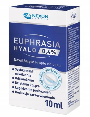 Зволожуючі очні краплі EUPHRASIA Hyalo 0,4% забезпечують тривале зволоження сухих, втомлених і чутливих очей. Вони швидко знімають почервоніння очей, заспокоюють подразнення та зменшують відчуття дискомфорту, спричинене зовнішніми факторами.