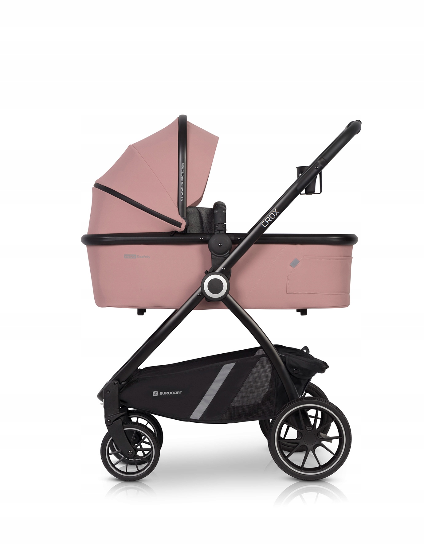Коляска 1 в 1 CROX має великі шарикопідшипникові колеса з гумовими шинами. Всі колеса амортизовані. Система передніх коліс, що самовирівнюється, може бути заблокована для руху прямо для зручного маневрування. Дуже великий кошик під коляскою обов'язково вміщає всі дрібниці, які знадобляться під час прогулянки.