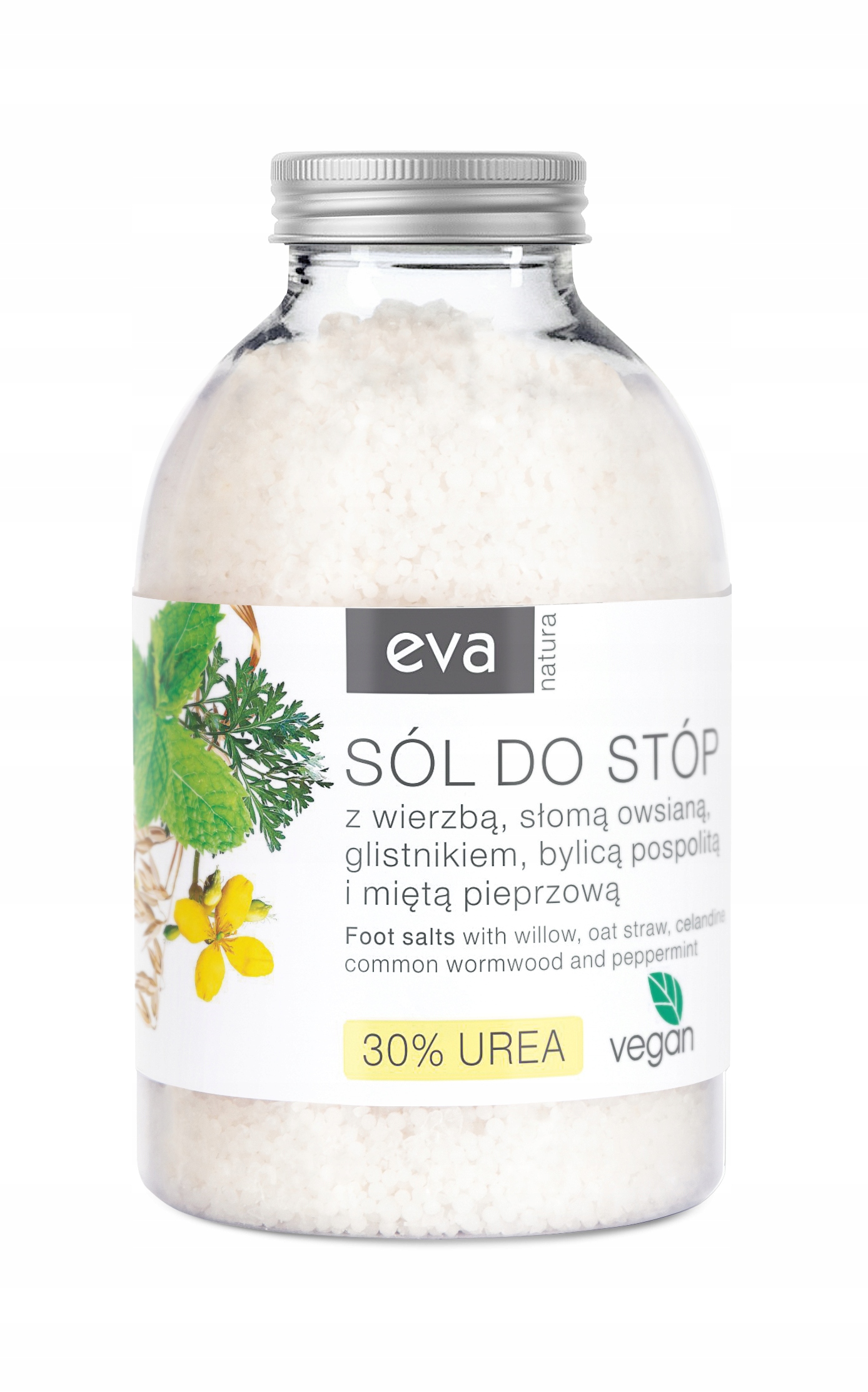 Сіль для ніг Eva Natura – перевірене рішення для втомлених ніг. Висока концентрація сечовини (30%) сприяє пом'якшенню і відлущуванню ороговілого епідермісу. Завдяки вмісту екстрактів верби, полину і чистотілу косметичний засіб має антиперспірантні властивості. Вміст вівсяної соломи та м'яти гарантує відчуття негайного зволоження та релаксації. Подаруйте своїм ніжкам трохи задоволення та насолодіться справжнім домашнім SPA!