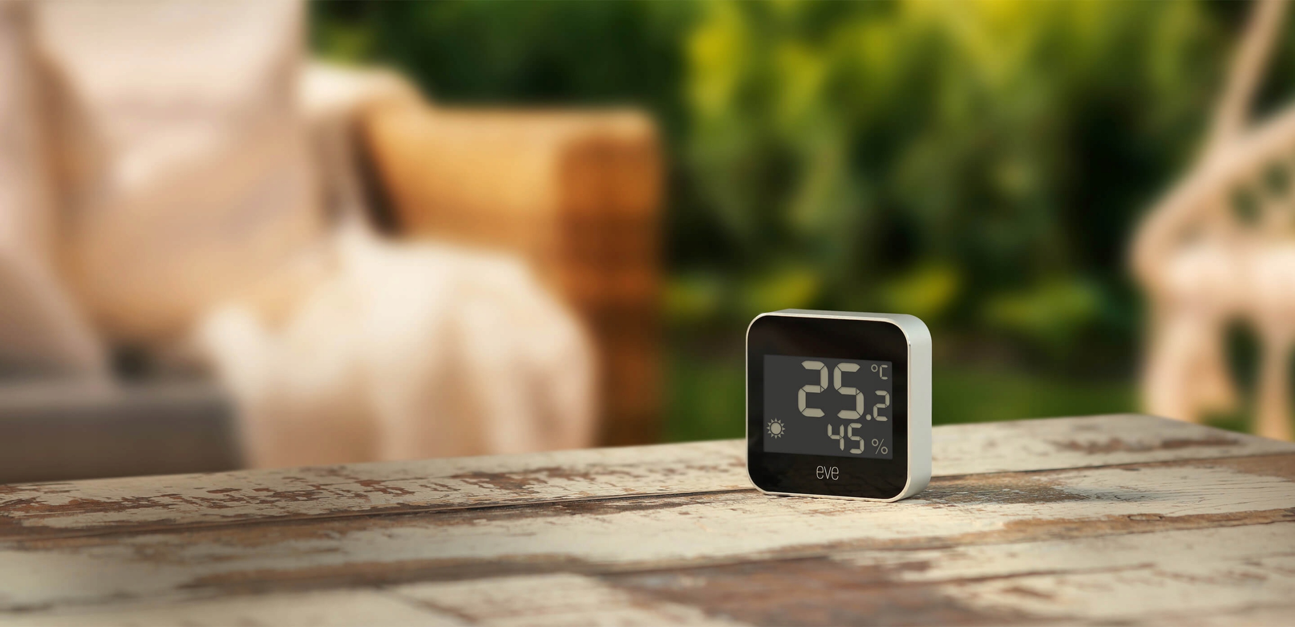 На терасі, в саду або на столі в альтанка? Розмістіть Eve Weather саме там, де вам це зручно. Елегантний дизайн із анодованого алюмінію з класом водонепроникності IPX3 також ідеально підходить для зовнішнього використання.