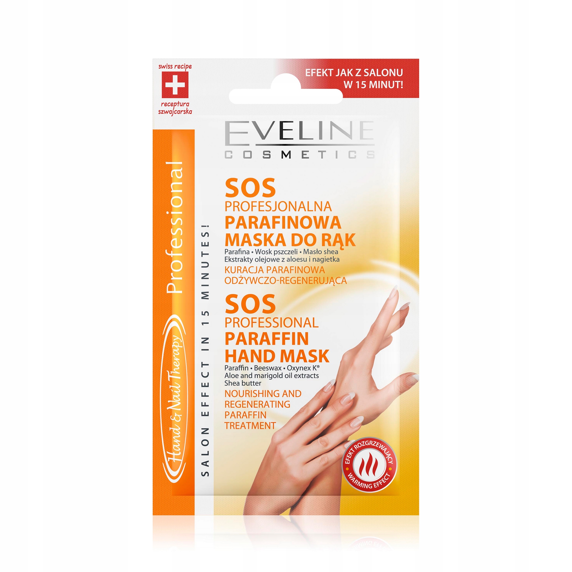 Маска потепління парафіну забезпечує професійний ефект через 15 хвилин. Формула продукту на основі швейцарського рецепту містить парафін, бджолиний віск, екстракти масла з календулою та маслом ши. Ці інгредієнти забезпечують глибоке харчування та регенерацію поверхні шкіри.