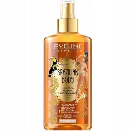 Eveline Brazilian Body LuxuryАвтозасмага 5в1можна використовувати після догляду за тілом і обличчям. Багатство рослинних екстрактів олії волоського горіха, гуарани та олії рожевого перцю інтенсивно зволожить та відновить тіло та обличчя. Туман створює ефект здорової залитої сонцем бразильської засмаги, яка зберігається до 7 днів. Технологія PureTan полегшує вбирання туману, а шкіра набуває тонкого засмаги. Мист, що регулярно використовується, зробить колір засмаги ще більш насиченим, а в поєднанні з іншими продуктами серії Brazilian Body зробить колір обличчя ще більш засмаглим і струнким.