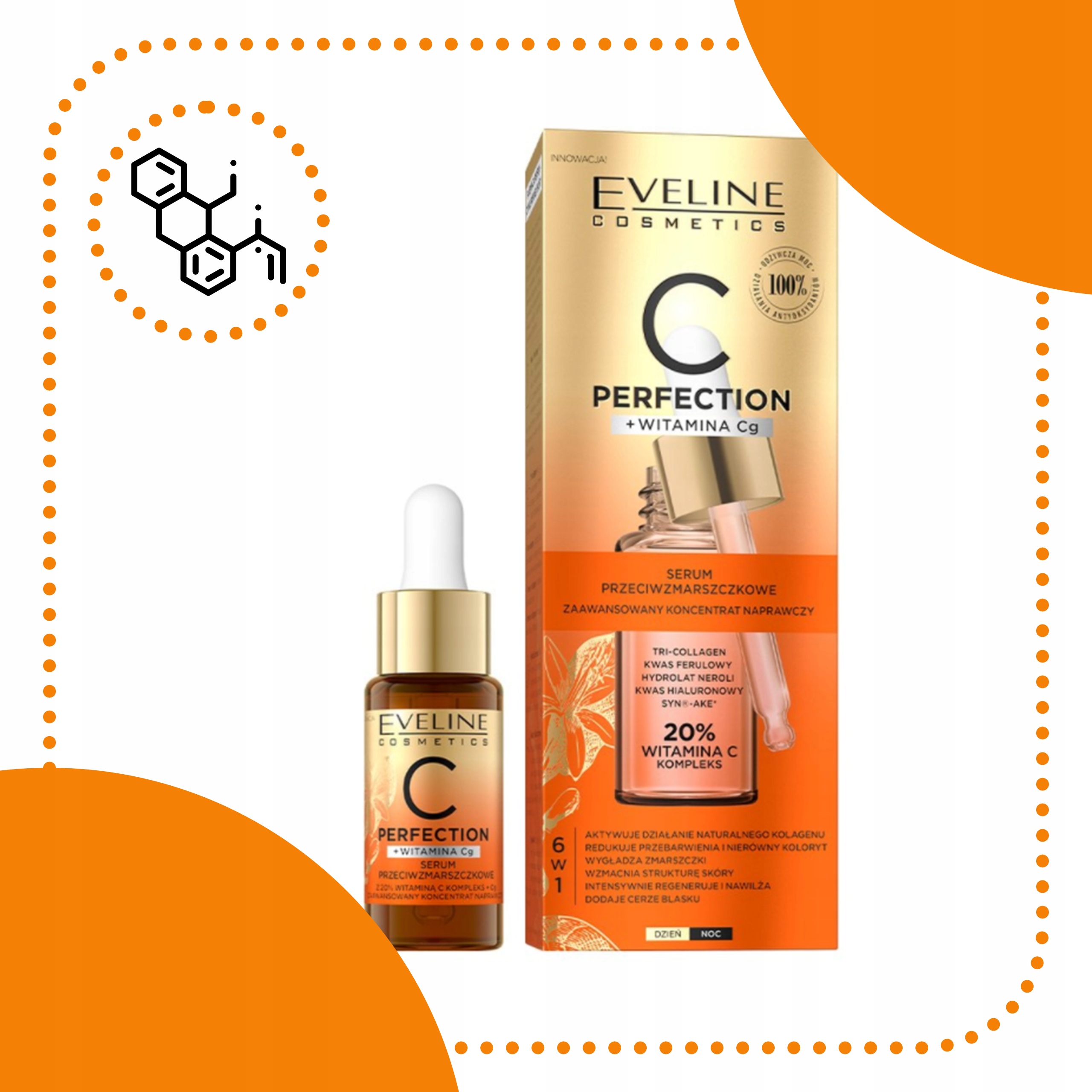 Сироватка проти зморшок Eveline C Perfection створена на основі20% концентрації вітаміну Сb>. Завдяки такій великій дозі він інтенсивно регенерує та уповільнює процеси старіння шкіри. Вміст ферулової кислоти, вітаміну Е, бакухіолу, гіалуронової кислоти та екстракту юзу робить препарат глибоко зволожує, розгладжує та повертає молоде сяйво. При регулярному застосуванні додатково омолоджуєі зміцнюєшкіру.