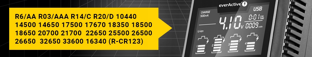 Зарядний пристрій для циліндричних літій-іонних і нікель-металгідридних акумуляторів everActive UC-4000 має функції для заряджання та тестування 1, 2, 3 і 4 літій-іонних, літій-залізо-фосфатних і нікель-гідридних акумуляторів у різних розміри: