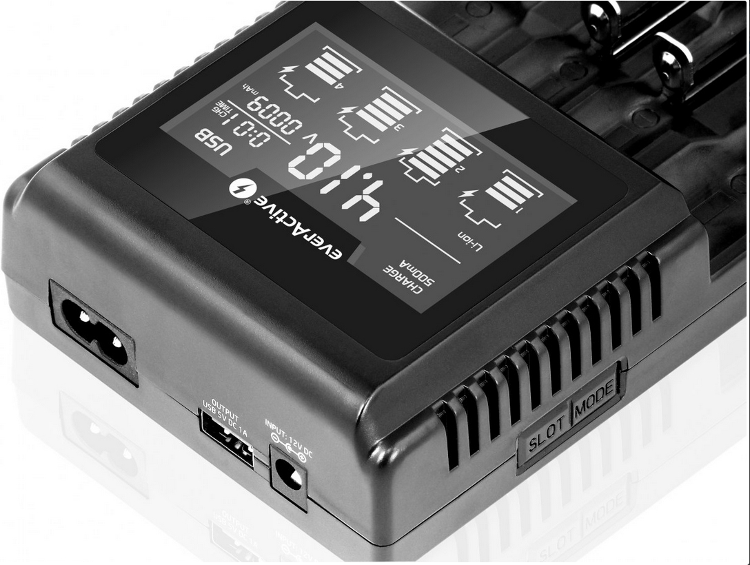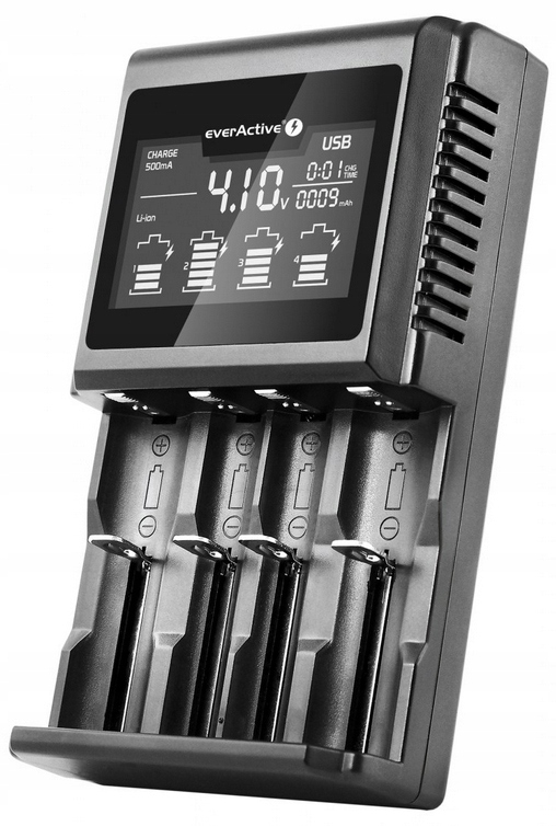 Зарядний пристрій дозволяє заряджати та тестувати 1–4 літій-іонні, літій-залізо-фосфатні та нікель-метал-гідридні батареї різних розмірів: