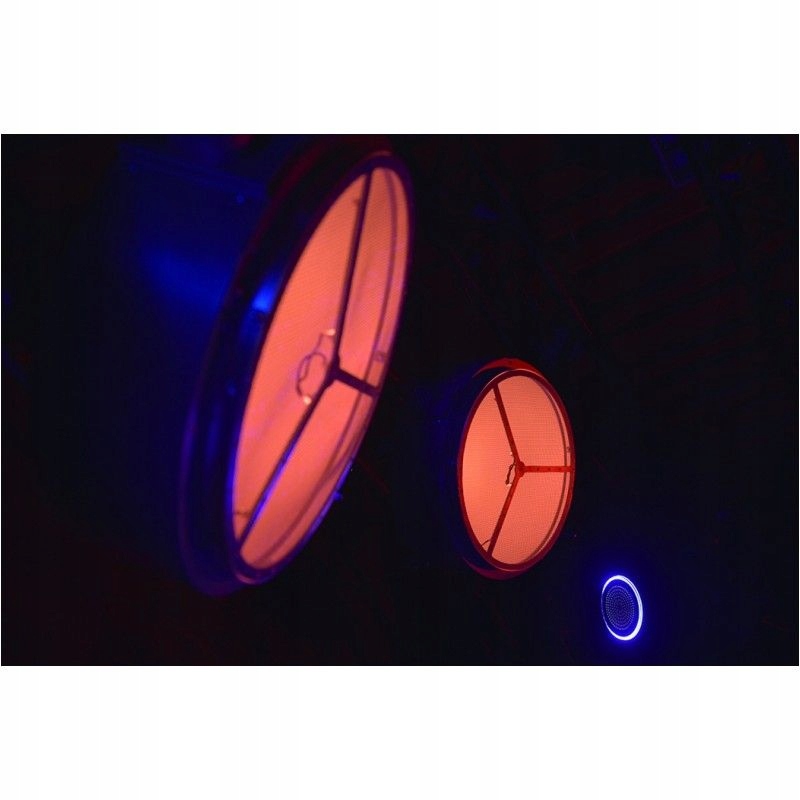 ✅ На задній частині корпусу розташовані розетки PowerCon (в тому числі «передай»), чотири розетки DMX (два входи і виходи), а також панель управління у вигляді LED-дисплея і трьох кнопок. (Меню, Вгору, Вниз). Використовуючи їх, ми можемо вручну встановити шаблон освітлення відбивача або вибрати один із кількох десятків вбудованих пресетів. Однак найбільш ефективним способом управління роботою підсвічування є протокол DMX. Завдяки цьому прожектором VINTAGE можна керувати за допомогою зовнішніх контролерів і консолей, або працювати в послідовному з'єднанні з іншими блоками цього типу. Тоді робота базується на режимі головний/підлеглий, у якому перший пристрій, під’єднаний до лінії, диктує роботу решти пристроїв.