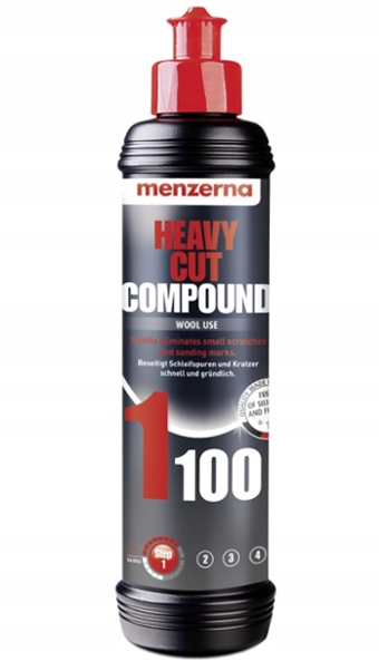 Menzerna 1100 Heavy Cut Compound. більш глибокі подряпини. Продукт не містить силіконів і мінімізує утворення пилу. Можна використовувати з вовняними та губчастими полірувальними подушечками.