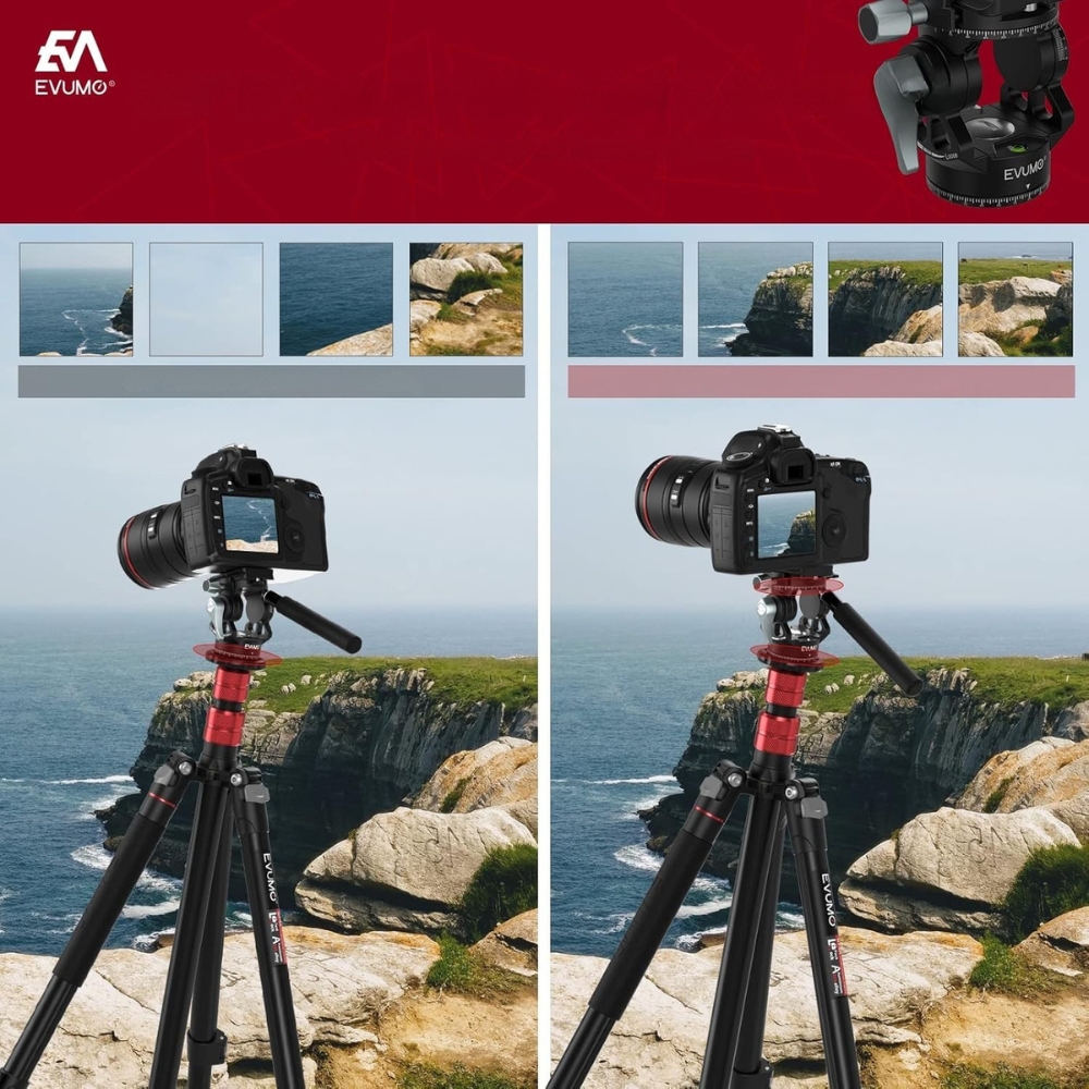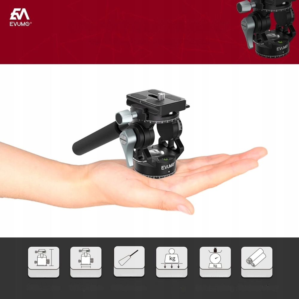 Професійна відеоголовка EVUMO є важливим інструментом для кожного творця — відеоблогера, фотографа та режисера. Компактний і водночас надзвичайно точний і плавний у використанні, він дозволяє повністю контролювати горизонтальний і вертикальний рух камери. Розроблено для мобільності та довговічності – ідеально підходить для подорожей, на вулиці та в студії.
