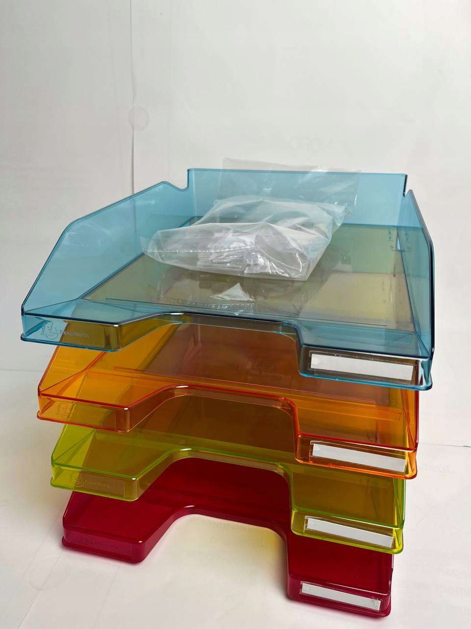 Колір: кожен 1x червоний, помаранчевий, зелений, синій. Поряд з ручкою мітки для опису. Набір полиць містить відстані, що збільшують їх здатність. Можливості вертикально або ступили. Специфікація: виготовлена з пластику, для форматів A4 та A4+, висота: 6,5 см.