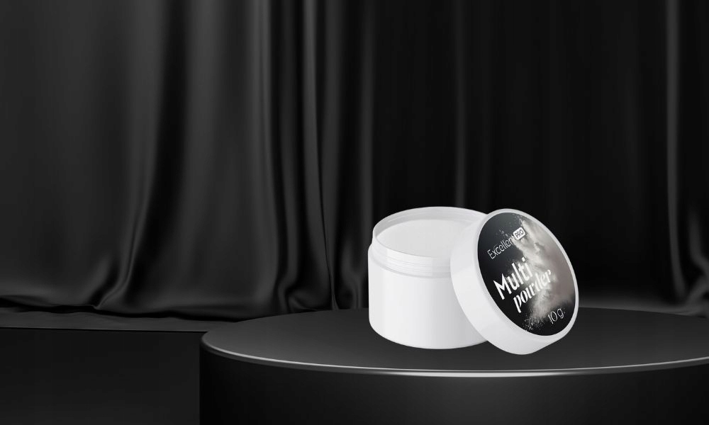 Multi Powder від Excellent PRO — універсальна акрилова пудра прозорого відтінку, закрита в елегантну матову баночку.