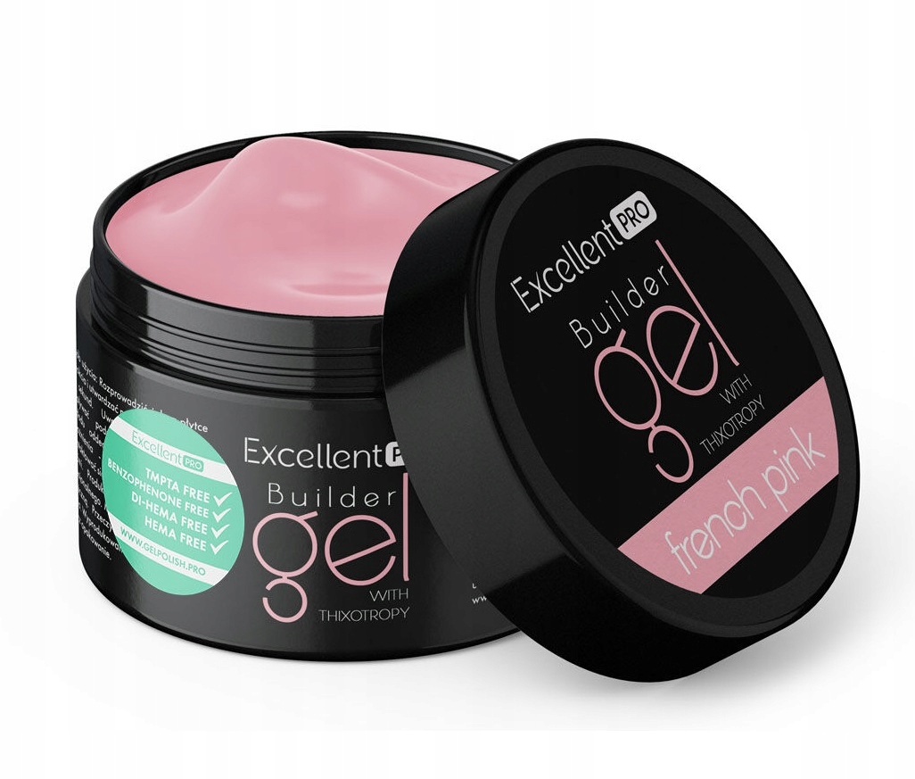 EXCELLENT PRO BUILDER GEL WITH THIXOTROPY FRENCH PINK - це однофазний, багатофункціональний гель з тиксотропією, створений для салонного, професійного використання світло-рожевого, молочного кольору. . Завдяки «рідкій пам'яті» працювати з гелем легко і приємно, адже гель не заливає кутикулу, добре вирівнюючи. Підходить для довгого нарощування на тіпсах і шаблонах, а також для зміцнення натуральної нігтьової пластини. Його твердість після затвердіння робить його особливо придатним для салонного, тривалого нарощування, а також для авангардних укладок. Гель має лінійну молекулярну структуру, а його ідеально підібрана консистенція, в'язкість і щільність гелю впливають на якість роботи. Сучасна формула створена для того, щоб використовувати техніку «гель без підпилювання», захистити тунель нарощених нігтів від розростання і скоротити термін служби до мінімуму. Особливо рекомендується для швидкого доповнення та корекції стилю.