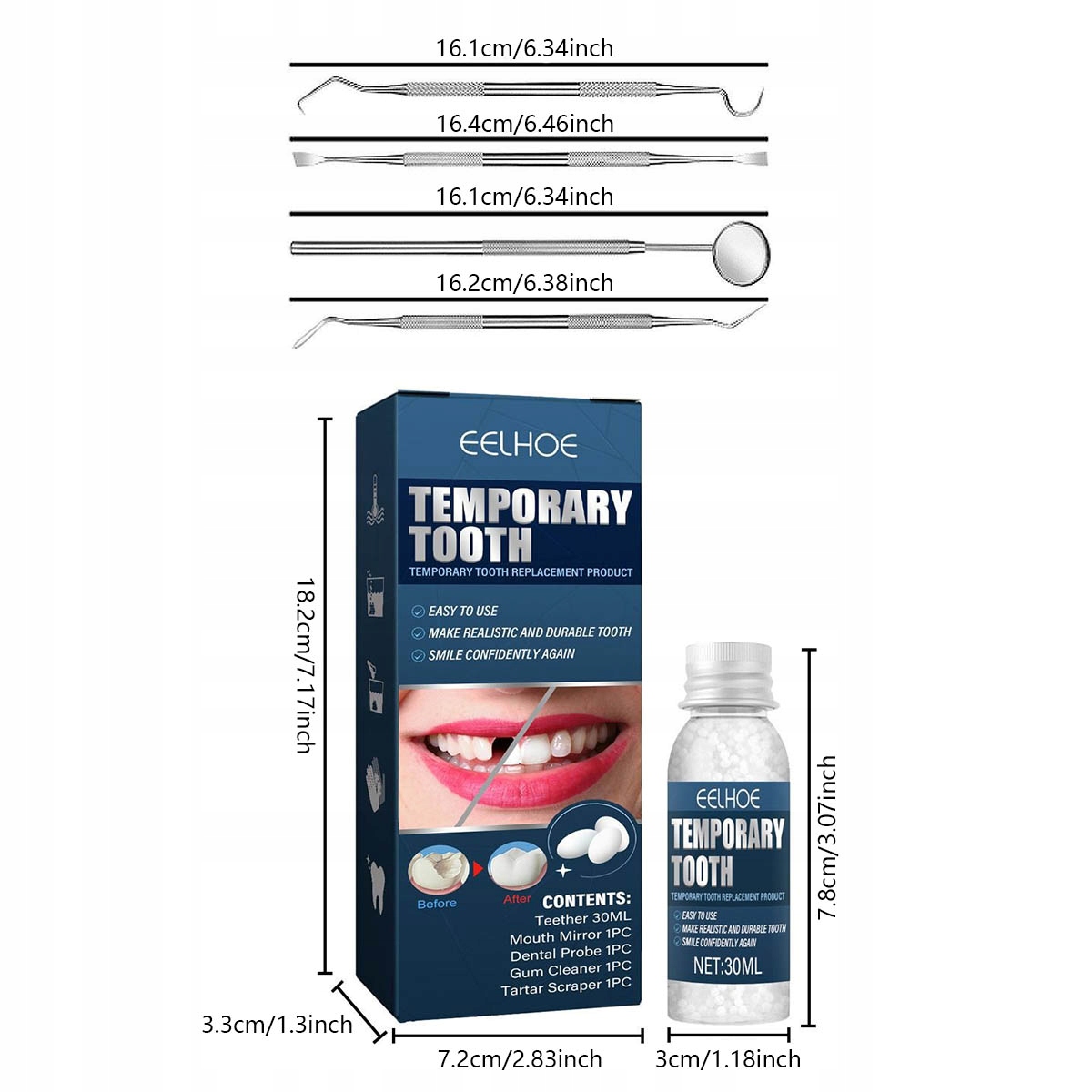 ✔️ Простота використання:Набір для пломбування зубів простий і зручний у використанні; не вимагає спеціальних інструментів, що дозволяє створити новий зуб всього за кілька хвилин.