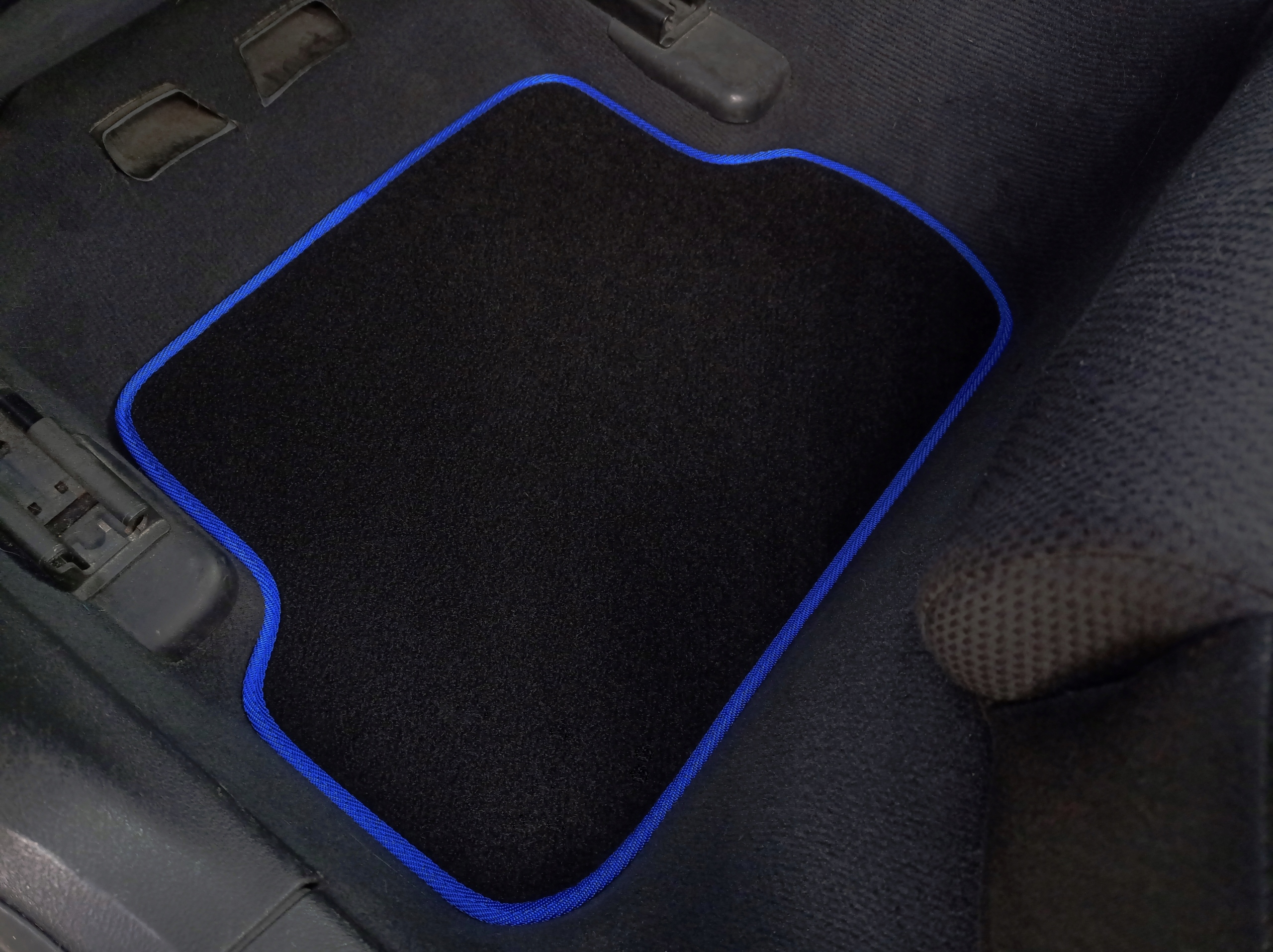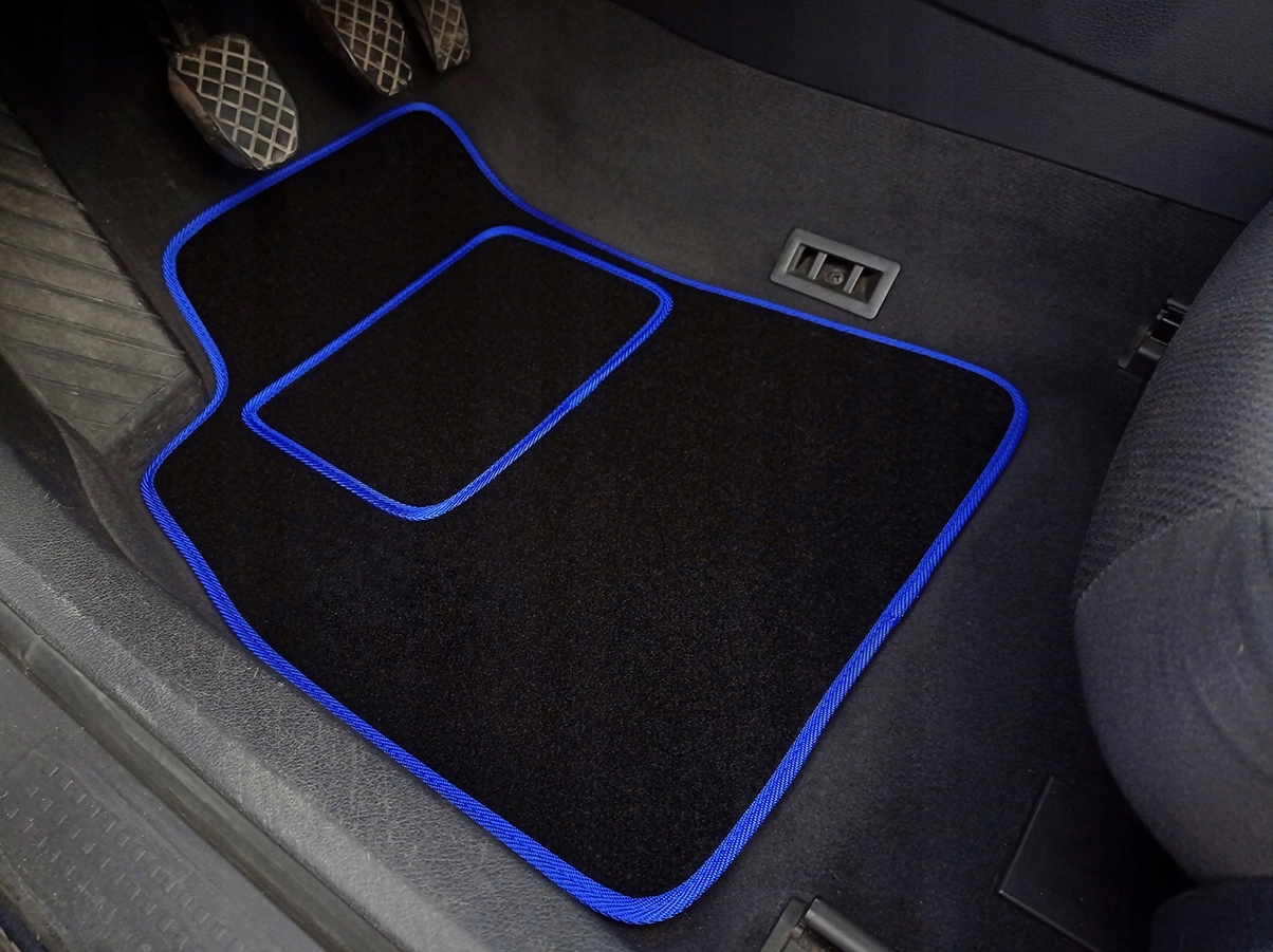 Нижче - набір велюрні килими в "додатковій" версії з вагою 2000 г/м2 товщиною близько 8 мм, обробленою міцною і міцною синьою обрізкою. Килими, розроблені та ретельно виготовлені Ласотою, пристосованими до форми підлоги вашого автомобіля, про який йдеться вище. Дно килимів покрито шаром грубої гуми, що запобігає і ковзає. Водії пришиті на килим, що розширює довговічність килима.