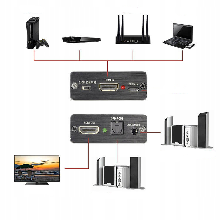 Витягувач HDMI до HDMI + аудіо (R/L+SPDIF) дозволяє підключити пристрій, що надсилає аудіо- та відеосигнали (тюнер, консоль, DVD, Blu-ray), до телевізора за допомогою кабелю HDMI. Крім того, ви можете отримати аудіосигнал із пристрою та надіслати його на приймач домашнього кінотеатру чи інший подібний пристрій. Завдяки цьому рішенню звук буде чути стандартно з динаміків телевізора і додатково з другого джерела при включенні ресивера. Цікаве рішення, коли ми хочемо контролювати та вирішувати, коли звук буде чути з даного пристрою.