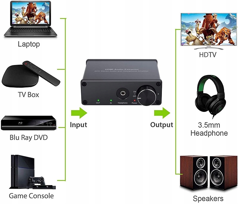 Extractor HDMI to HDMI + Audio R/L дозволяє підключити пристрій, що надсилає аудіо- та відеосигнали (тюнер, консоль, DVD, Blu-ray) до телевізора за допомогою кабелю HDMI. Крім того, ви можете отримати аудіосигнал із пристрою та надіслати його на приймач домашнього кінотеатру чи інший подібний пристрій. Завдяки цьому рішенню звук буде чути стандартно з динаміків телевізора і додатково з другого джерела при включенні ресивера. Цікаве рішення, коли ми хочемо контролювати та вирішувати, коли звук повинен бути почутий з даного пристрою.